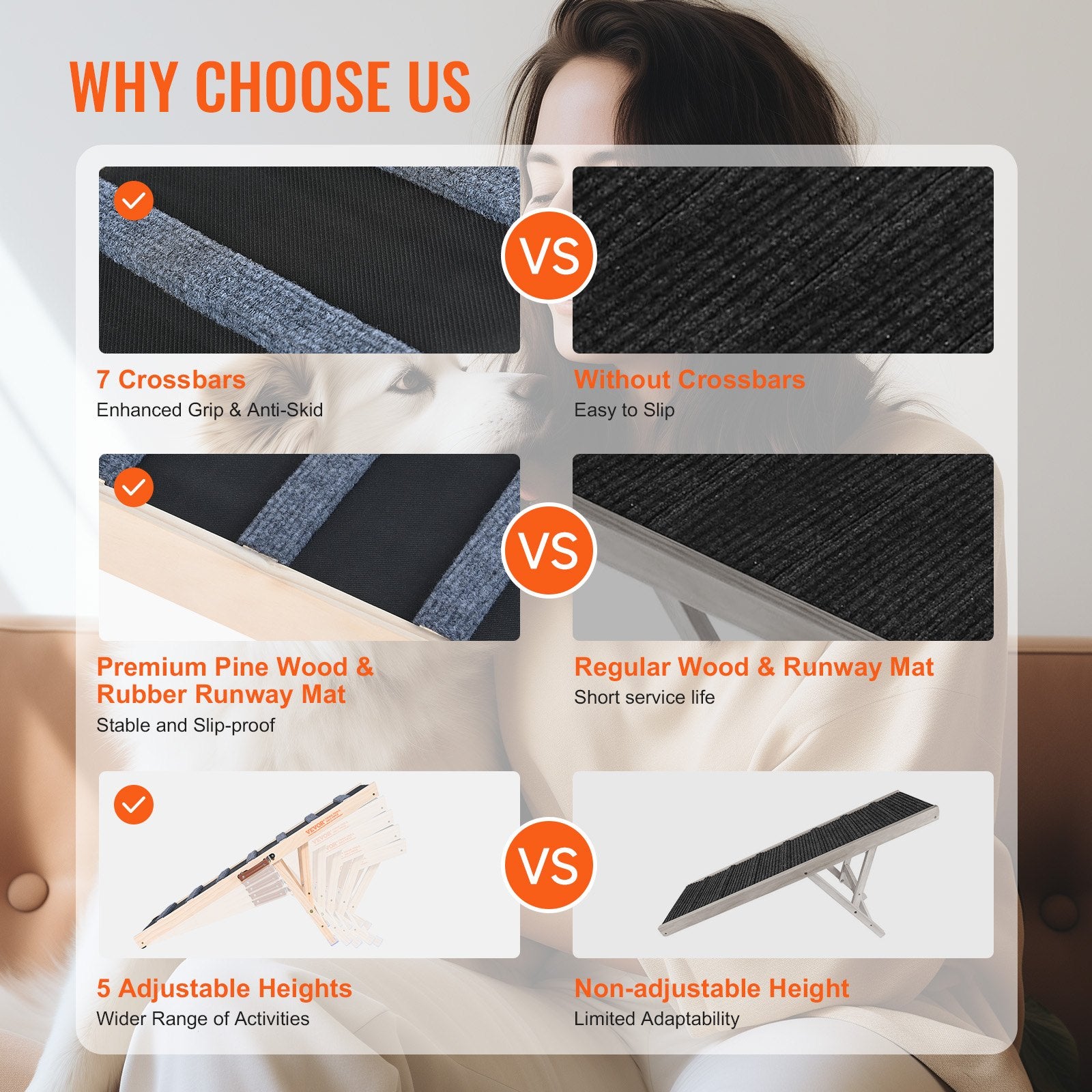 - Robust och hållbar: Denna justerbara hundramp i massivt trä är tillverkad av premium furu och är exceptionellt stabil och kan stödja husdjur som väger upp till 45 kg. De mjuka gummikuddarna i botten säkerställer stabilitet under ditt husdjurs uppstigning.