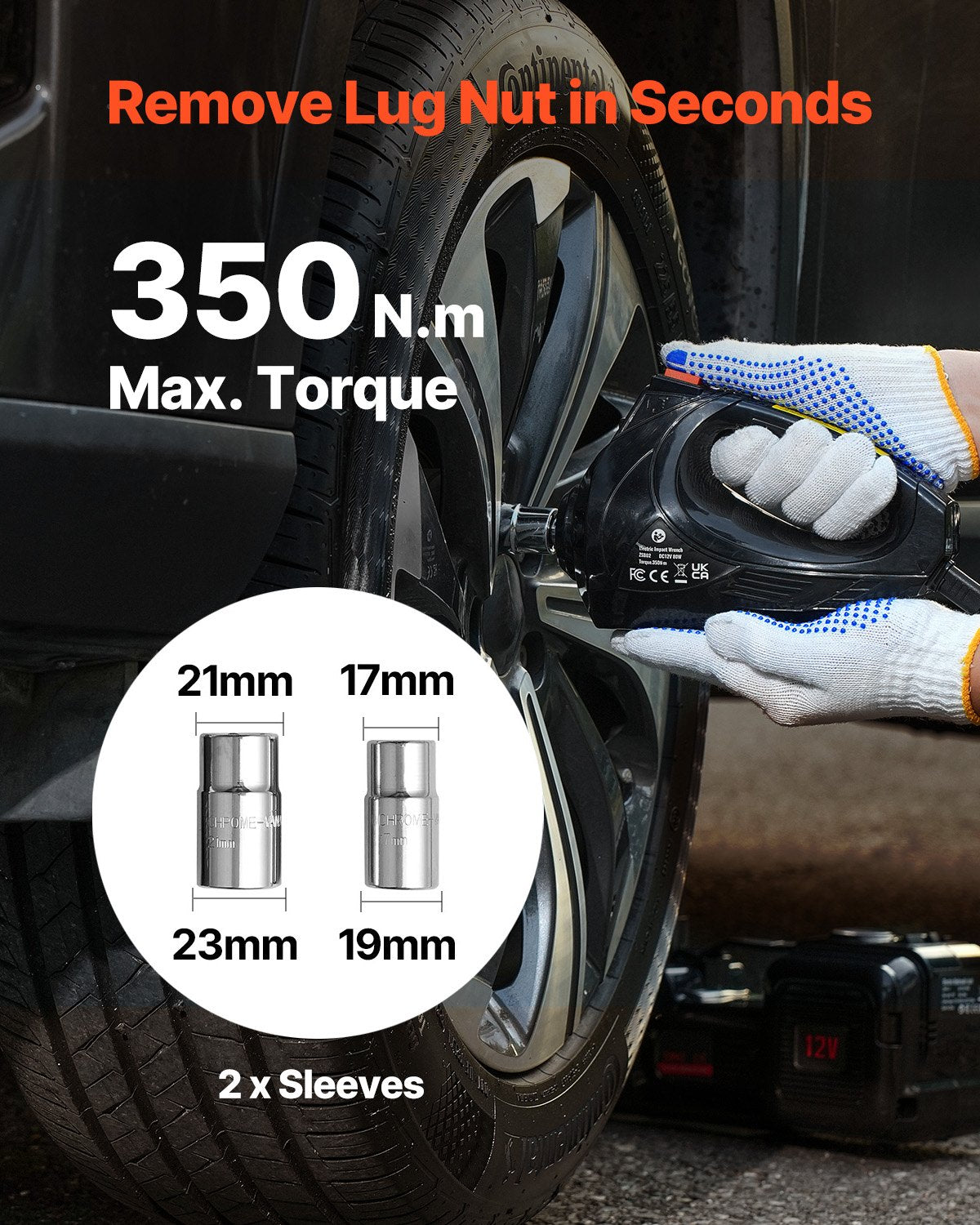 - Effektiv elektrisk skiftnyckel: Med ett maximalt vridmoment på 350 Nm drar eller lossar denna elektriska skiftnyckel bultar på några sekunder. Inkluderar 2 sexkantshylsor, kompatibla med 4 bultstorlekar (17/19 mm och 21/23 mm), passar de flesta hjulmuttrar.