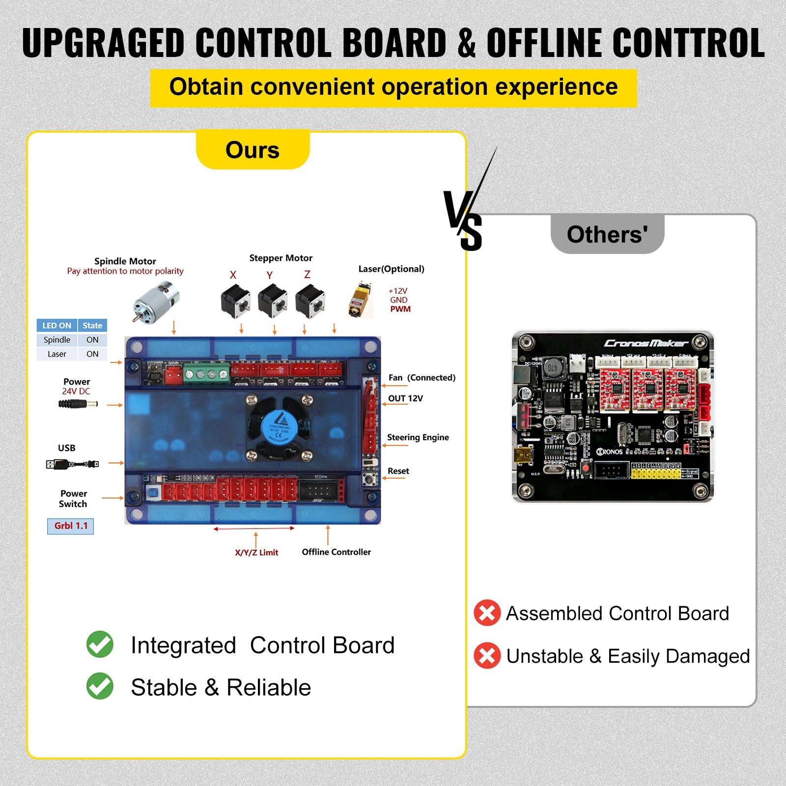 - Uppgraderat styrkort: Den integrerade GRBL-kontrollen har full funktionalitet och stabilitet. Fördelarna med offline-kontrollen ligger i följande: 1. Ingen anslutning till datorn behövs; 2. Godtyckligt val av offline-filer för gravering. 3. Justera manuellt X-, Y- och Z-axlarnas position som gravyrens startpunkt, slå manuellt på eller av spindeln. 4. Hög precision: mindre än 0,003 tum.