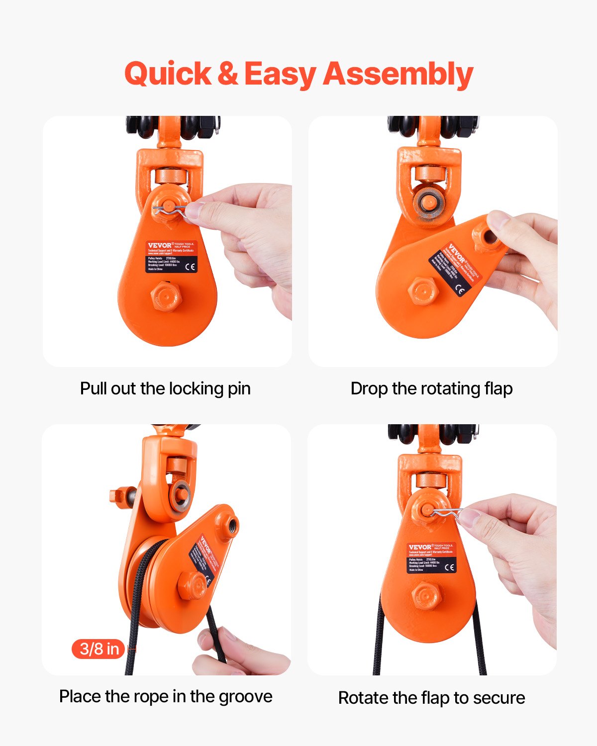 - Flexibla användningsvinklar: Dragblocket med krok har en 180° vridring som låter dig justera dragvinkeln för att passa trånga utrymmen. Den 360° roterande kroken hjälper dig att lyfta mer effektivt, vilket minskar belastningen och förbättrar lyftkraften.