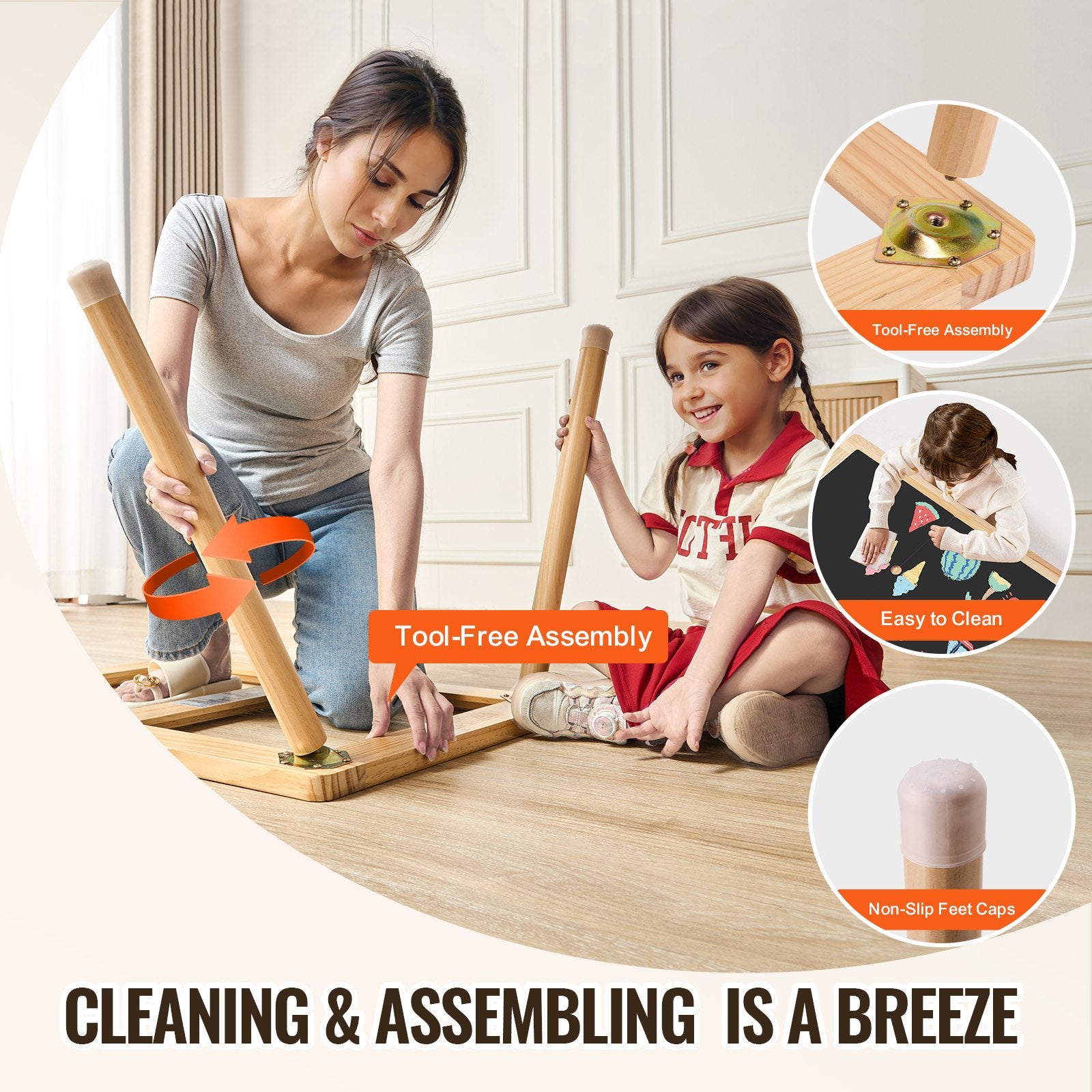 - Lätt att montera och underhålla: Detta sensoriska lekbord kräver inga verktyg för montering – det behöver bara fästas benen. Utrustat med fyra halkfria fotkåpor skyddar det dina golv från repor och minskar risken för oavsiktliga stötar. Den släta ytan kan enkelt torkas av med en fuktig trasa, vilket gör att dina barn kan rita och skapa fritt.