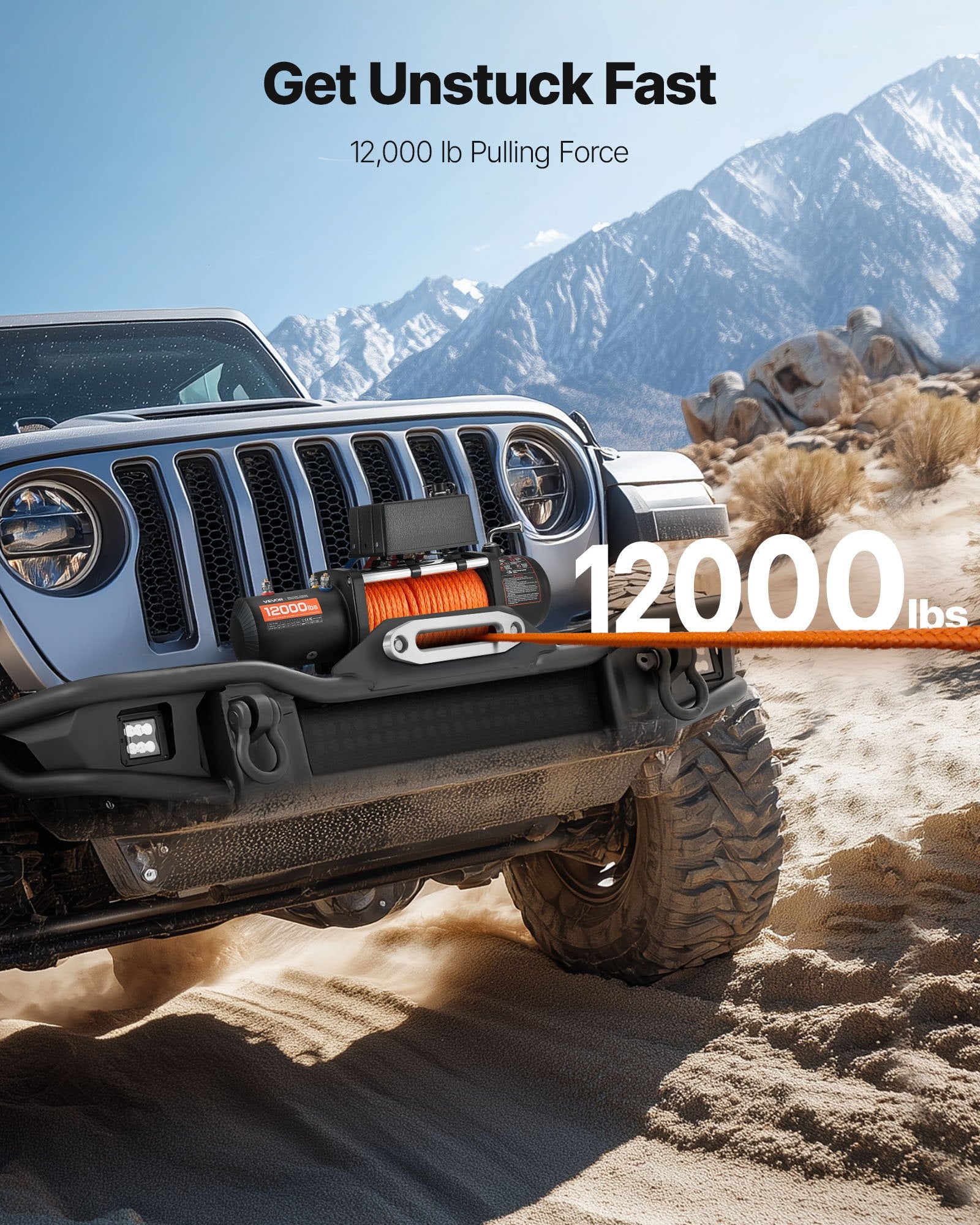 - Hållbar i alla väder: Det 0,36 tum x 75,5 fot stora 12-trådiga syntetiska repet motstår solljus, slitage och brott. Med ett IP55-förseglat, belagt legeringshus förblir lastbilsvinschen tålig mot damm, regn och tuff terräng.