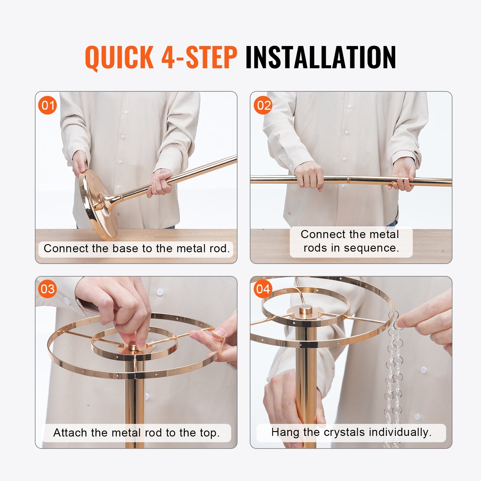- Enkel montering: Monteringen av detta kristallblomställ är enkelt och verktygsfritt och kräver bara fyra steg: Steg 1 - Anslut basen till metallstången, Steg 2 - Montera metallstavarna i tur och ordning, Steg 3 - Anslut metallstången till toppen, Steg 4 - Fäst kristallerna individuellt. Monteringen kan slutföras på bara några minuter.