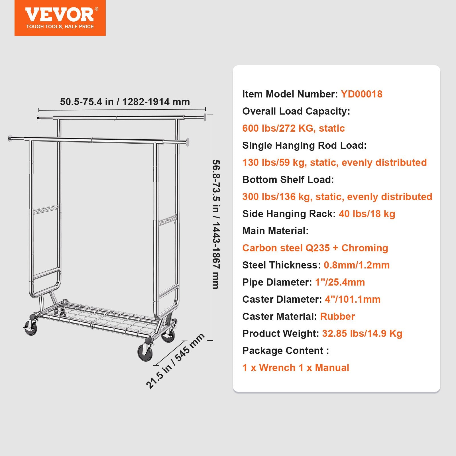 - Flyttbar eller fast: VEVOR rullande klädställ har fyra hjul, varav två är låsbara. Oavsett om du enkelt flyttar stället över ditt sovrum för att välja kläder eller säkert parkerar det på plats under strykning, säkerställer dessa mångsidiga hjul smidig mobilitet och stadig stabilitet, och anpassar sig till alla situationer.