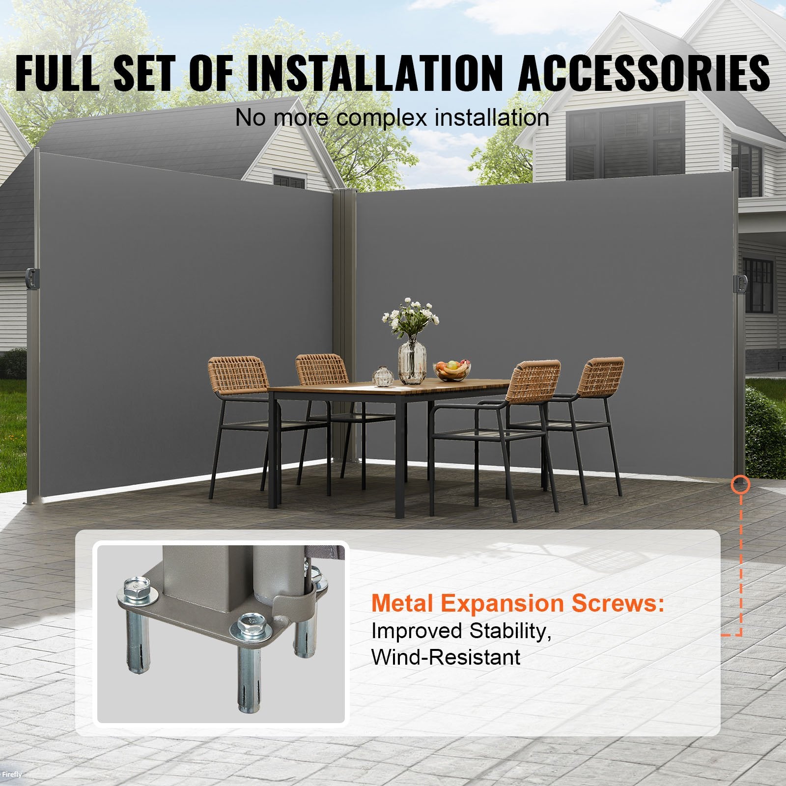 - Enkel installation: Vår infällbara uteplatsskärm är utformad för användarvänlighet och är enkel att installera och levereras med kompletta installationstillbehör. Inga professionella verktyg eller färdigheter behövs.