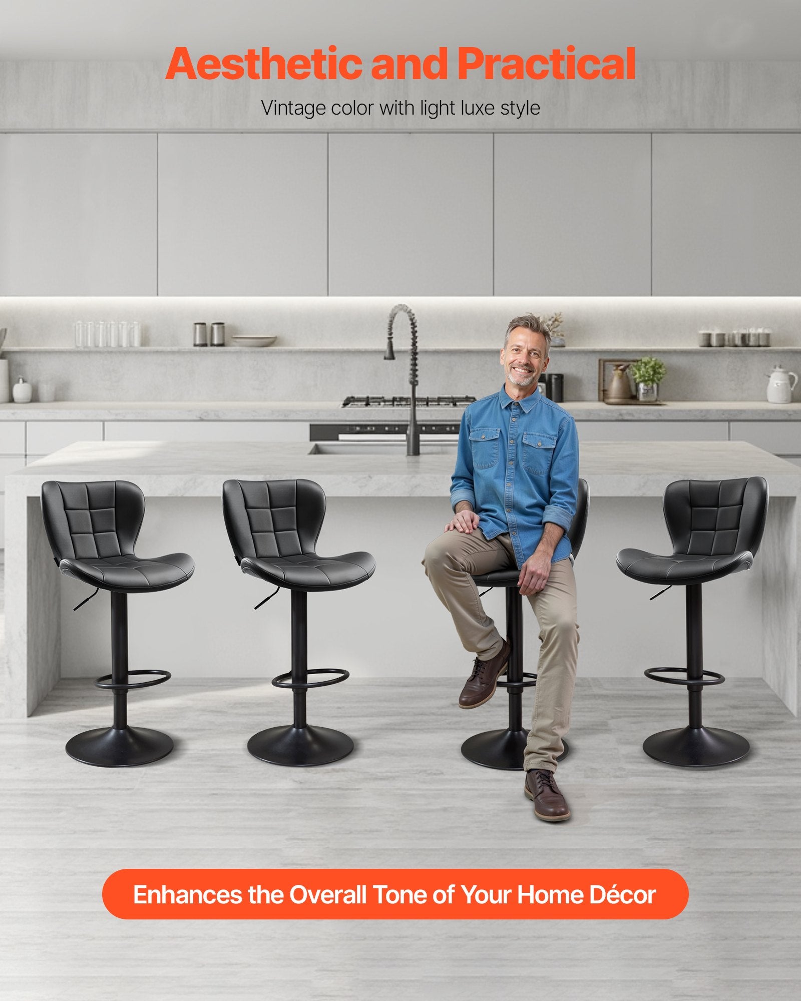 Barstolsset med 4, moderna PU-läderpallar med bänkhöjd, snurrbar köksstol med ryggstöd och fotstöd, höjdjusterbar armstöd, barstolar med armstöd för kök och matsal, svart