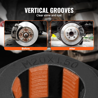 - Komplett storlekssortiment: Verktygssatsen för omgängning av axelspindeln innehåller M20 x 1,25, M20 x 1,50, M22 x 1,00, M22 x 1,50, M24 x 1,50, M24 x 2,00, 13/16 tum x 20 UNF, 3/4 tum x 20 UNF och en 27 mm förlängningsstång. Perfekt för rengöring eller reparation av spindelgängor, axelbultar och hjulbultar.