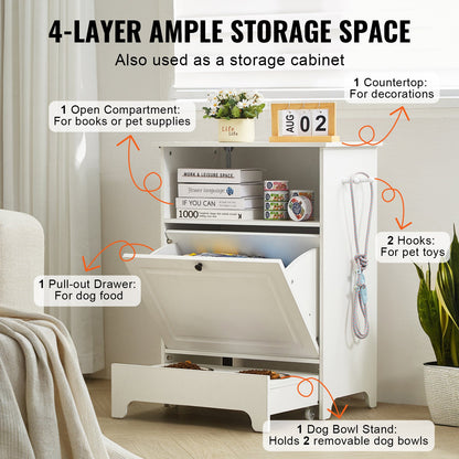 - Gott om förvaringsutrymme: Detta upphöjda hundskålsställ fungerar även som ett stort förvaringsskåp som rymmer alla dina husdjurstillbehör. De två sidokrokarna kan hålla leksaker och koppel, det utdragbara skåpet förvarar matpåsar och hyllorna och den övre ytan är perfekta för dekorationer, böcker, burkar, hundkappor eller godis.