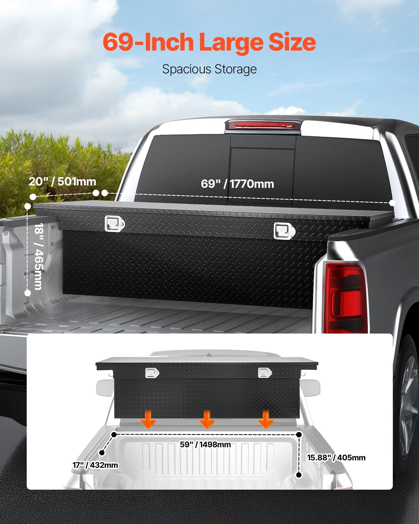 Verktygslåda för Crossover Truck, 69x20x18 tum, Kraftig verktygslåda i aluminium med diamantstruktur, Verktygslåda för pickup-flak, husbilssläpvagn, Vattentät förvaringsorganisatör med lås, nycklar, sidohandtag, svart