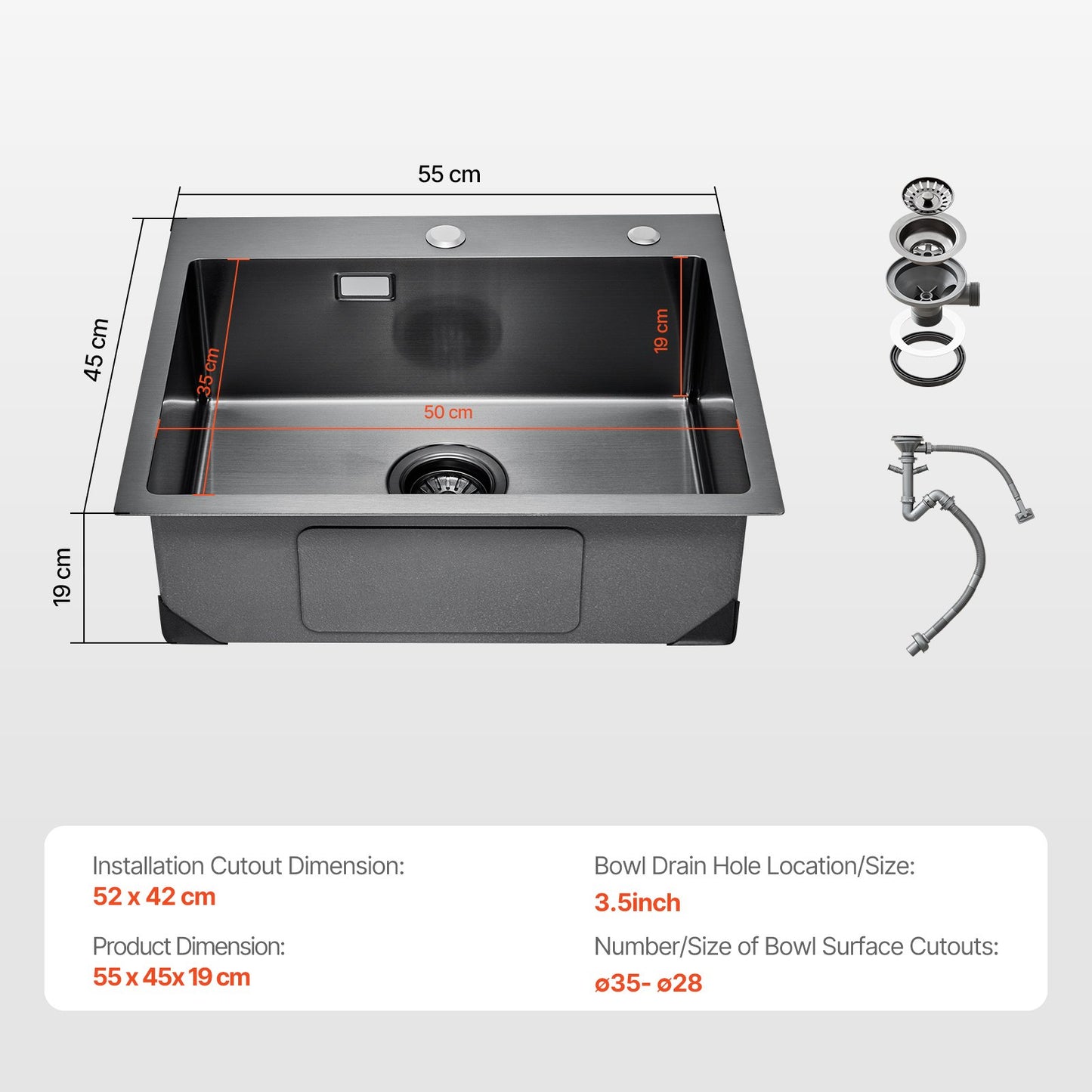 55 cm diskbänk, toppmonterade diskhoar i 304 rostfritt stål, nedfällbar enkel ho med tillbehör, diskmaskin för husbil, förberedelsekök och bar (svart)