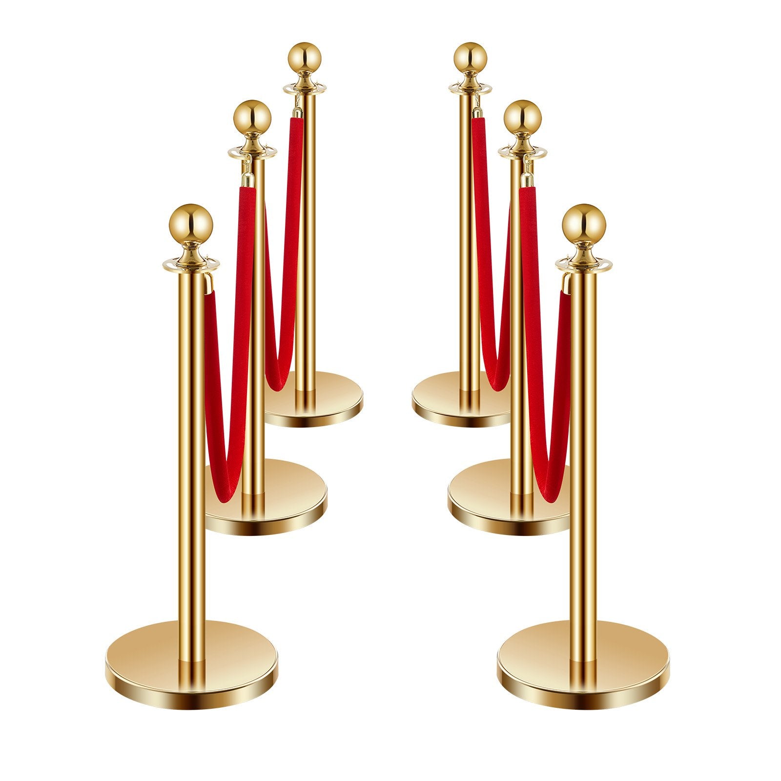 Stolpar och sammetsrep 6 st, ihålig bas med stolpe i rostfritt stål, 4 röda sammetsrep och stolpar, avspärrningar för folkmassor, guldfärgade stolpar, röda mattstänger för festtillbehör