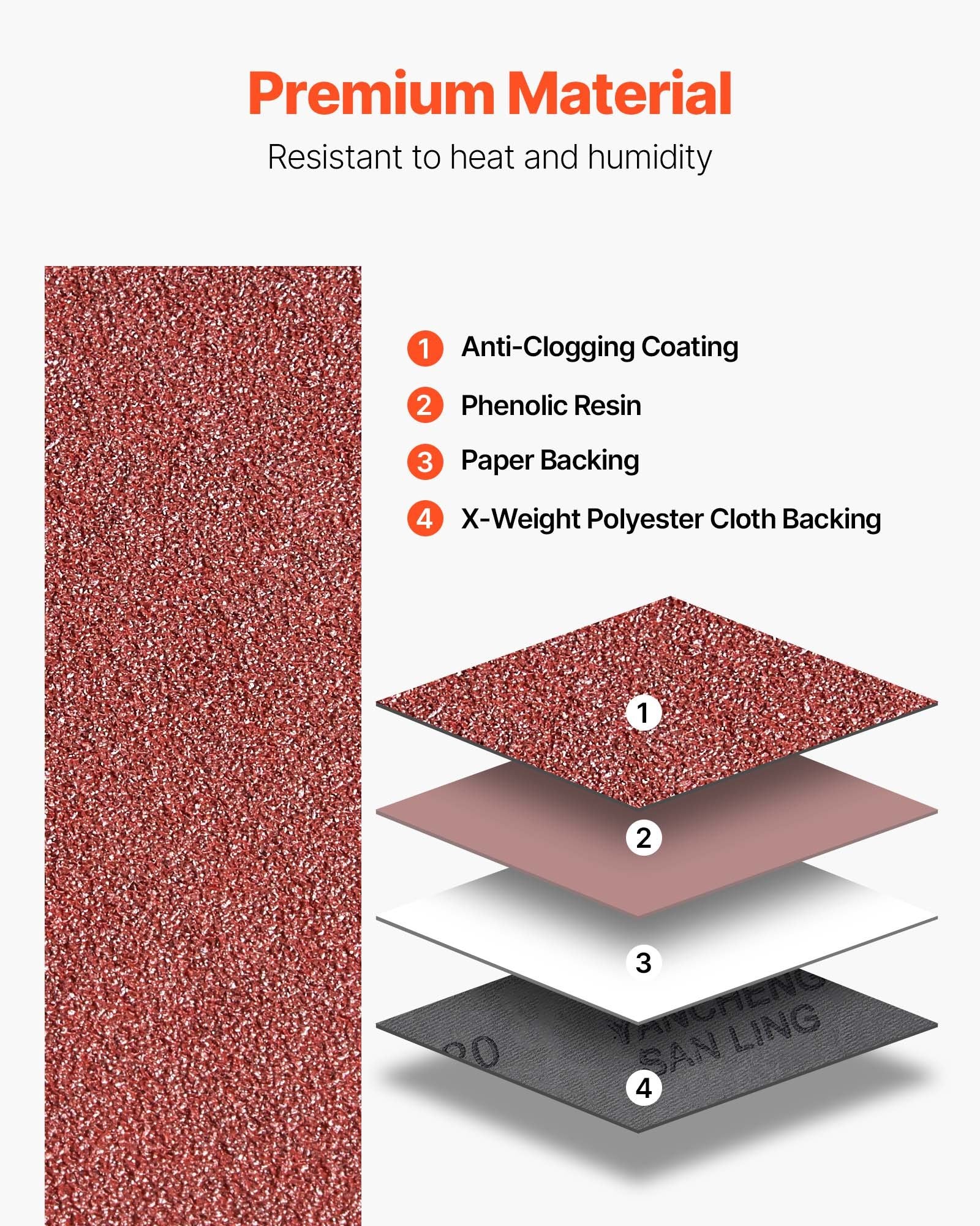 - Högkvalitativ konstruktion: Denna flerskiktade struktur är tillverkad med en anti-igensättningsbeläggning, fenolharts, pappersbaksida och X-weight polyestertygbaksida och ger utmärkt värme- och fuktbeständighet, långvarig hållbarhet och stabil slipning för en professionell finish.