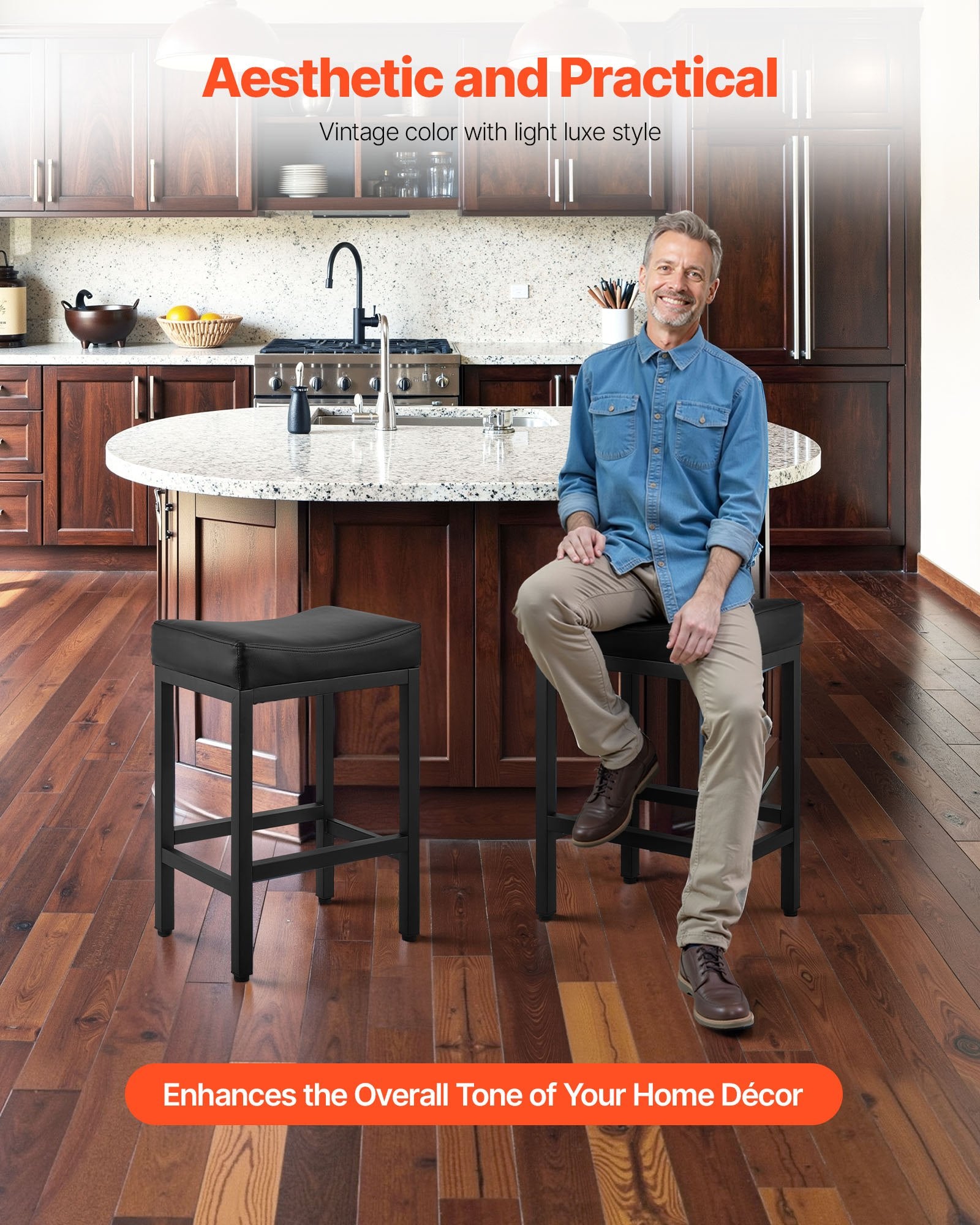 Barstolsset om 2, PU-läderpallar med bänkhöjd, 62 cm barstol med sadelsits och metallben, enkel montering, rygglös barstol, barö för kök, matsal, café, svart