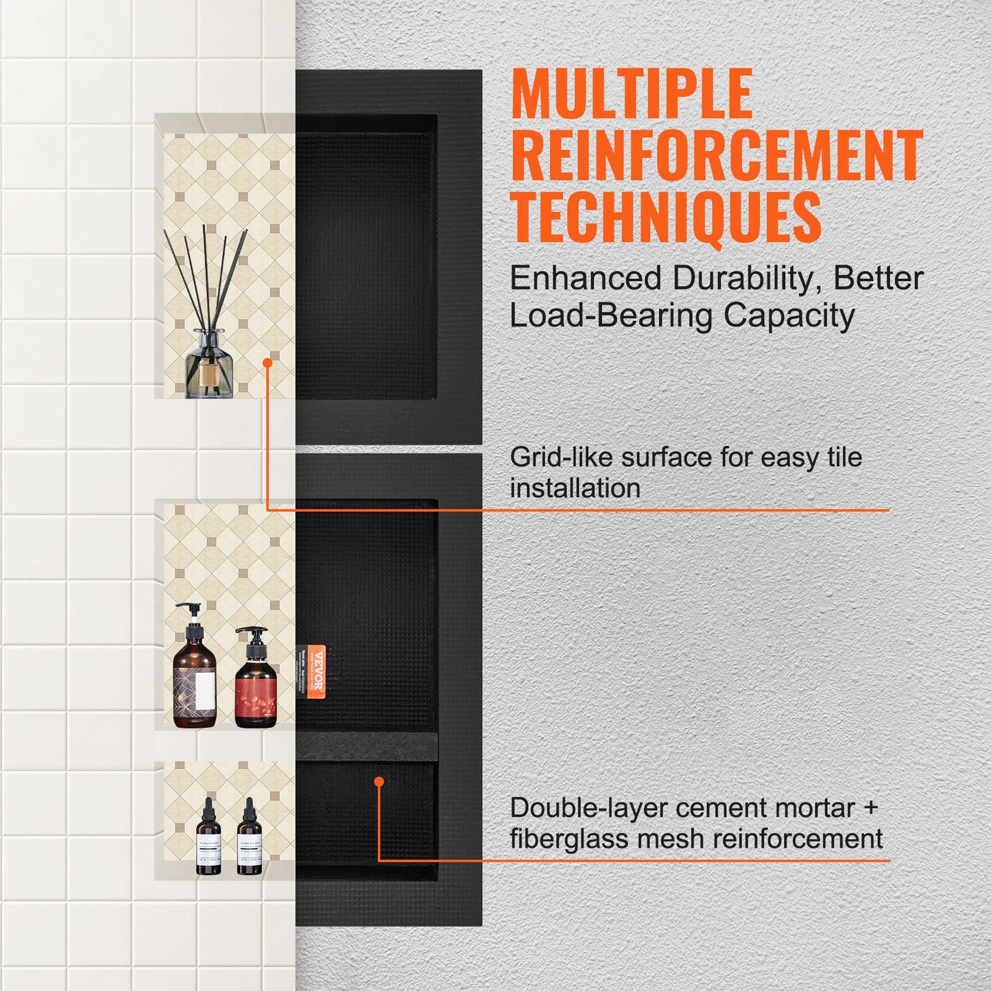 Duschnisch redo för kakel 40,64x40,64cm & 40,64x50,8cm, trippel hyllplan, fyrkantiga hörn, vägginfälld nisch, förseglad skyddsnivå, modern tvålförvaringsnisch för duschbadrum, svart