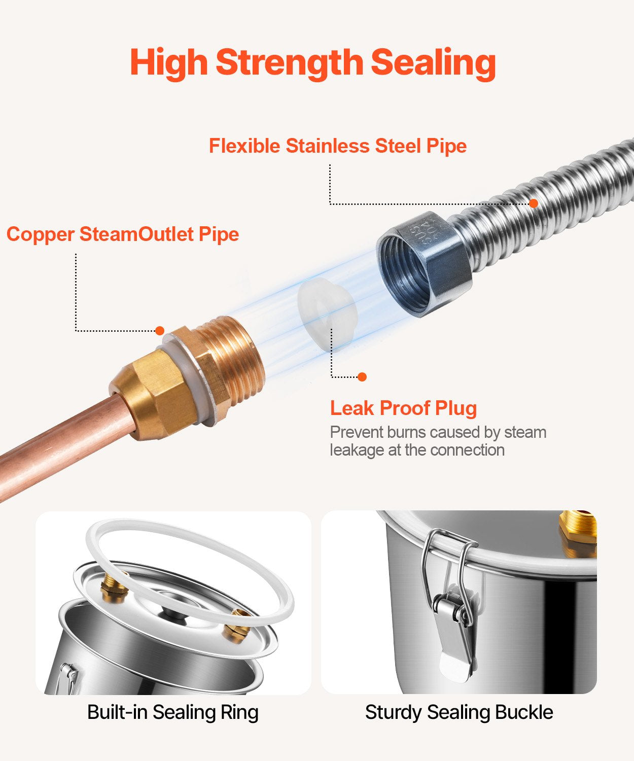 - Säker jäsning och uppvärmning: Jäsningstrumman är bekväm att använda. En enkelriktad avgasventil släpper ut gaser som produceras under jäsningen, vilket minskar det inre trycket. Den förtjockade botten av rostfritt stål är kompatibel med olika uppvärmningsmetoder som vedeldning, gasugnar och gasspisar, vilket förhindrar deformation och skador. Temperaturmätaren på locket visar temperaturer i Celsius och Fahrenheit, vilket underlättar temperaturövervakningen under destillationen.