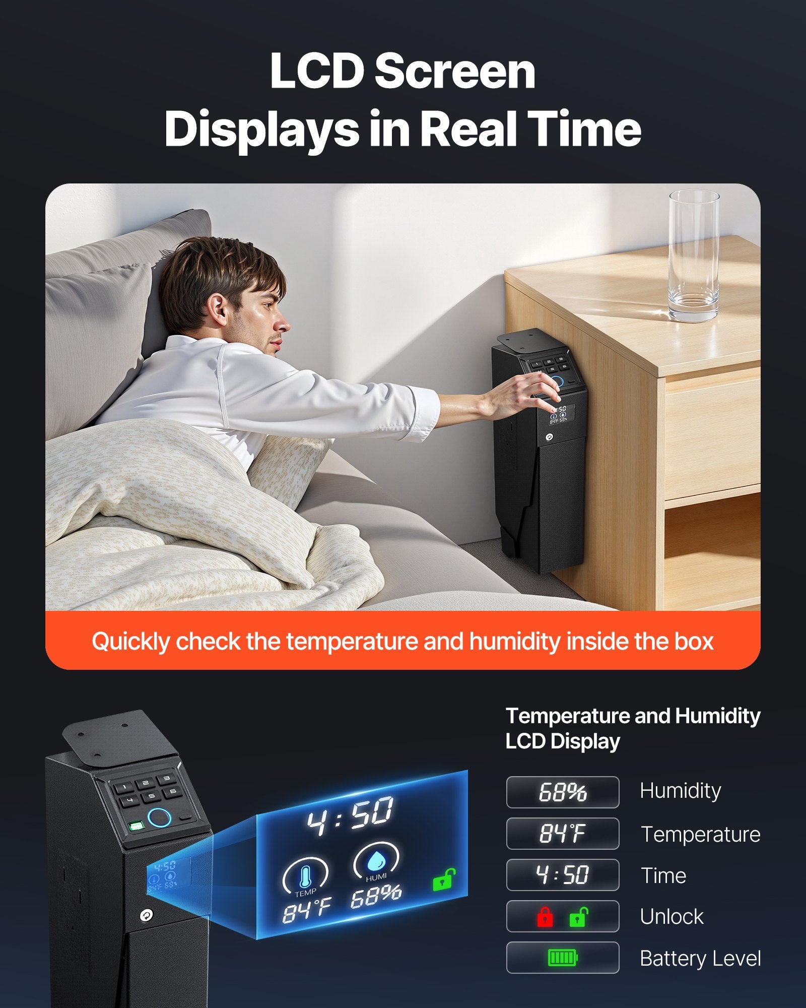 - Temperatur- och luftfuktighetsdisplay: Vapenskåpet rymmer en fullstor pistol och ett magasin, och har en LCD-display för snabb övervakning av temperatur och luftfuktighet. Läs enkelt av batterinivån och tillsätt torkmedel om luftfuktigheten är hög.