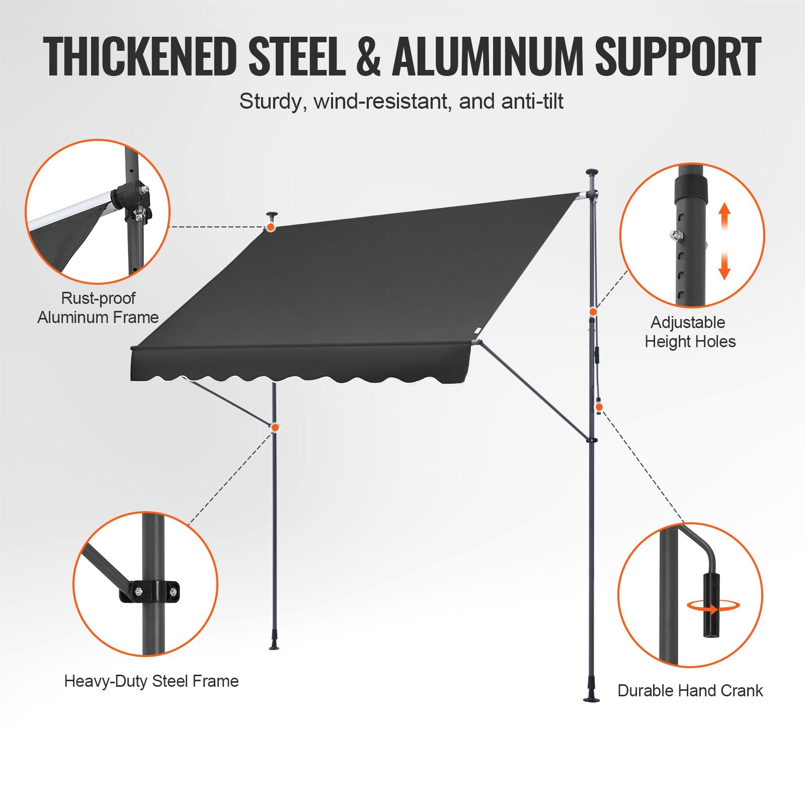 - Användarvänlig design: Den övre handveven gör det enkelt att justera vinkeln på den infällbara markisen från 0° till 90°, vilket förbättrar användbarheten och bekvämligheten för alla dina skuggningsbehov.