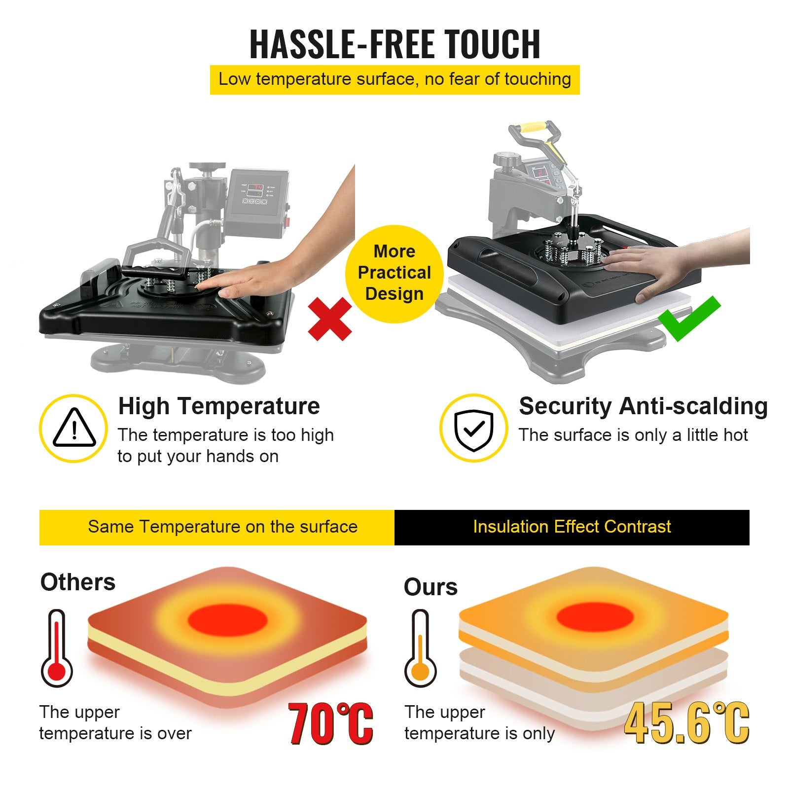 - 【360° SVÄNGBAR DESIGN】- Den svängbara armen gör att trycket appliceras direkt och jämnt på sublimeringsmaskinen, vilket förbättrar överföringskvaliteten. Samtidigt gör den att värmeelementet kan röra sig åt sidan, vilket minskar risken för oavsiktlig kontakt.