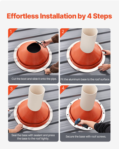 - Enkel installation, praktiskt läckageskydd: Kapa bara takskyddet till önskad storlek, försegla basen med tätningsmedel och fäst den vattentäta basen med skruvar. Takskyddet för höga temperaturer ger sedan ett pålitligt och långvarigt skydd för ditt tak och dina ventilationsrör, vilket säkerställer en säker och läckagesäker tätning.