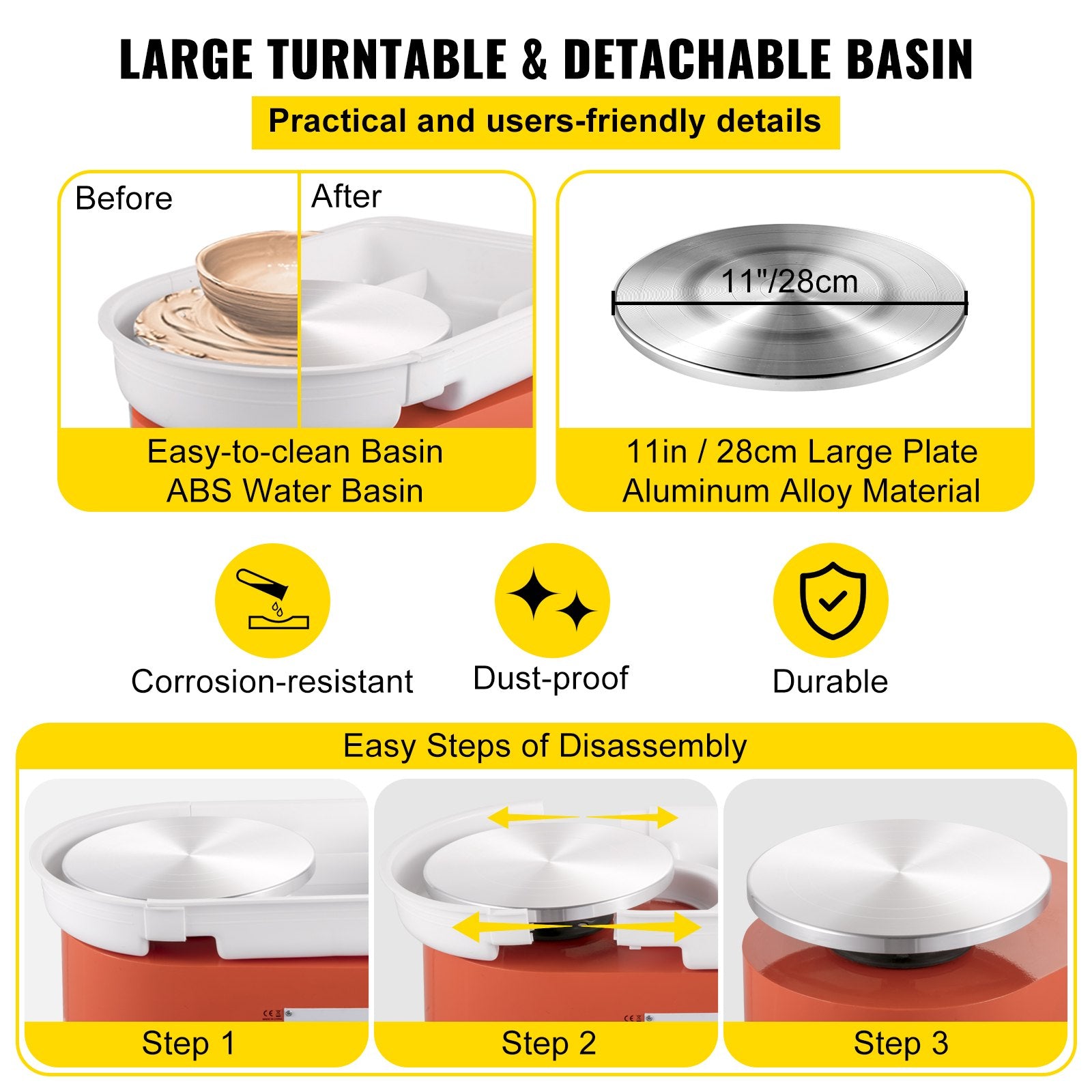 - 11-tums aluminiumfälg: En 28 cm stor skivspelare i aluminium gör det möjligt att snabbt rita stora delar. Dessutom förhindrar en sluten vattenbehållare att lera eroderar och tränger in i flygkroppen. Den är dessutom avtagbar för enkel rengöring.