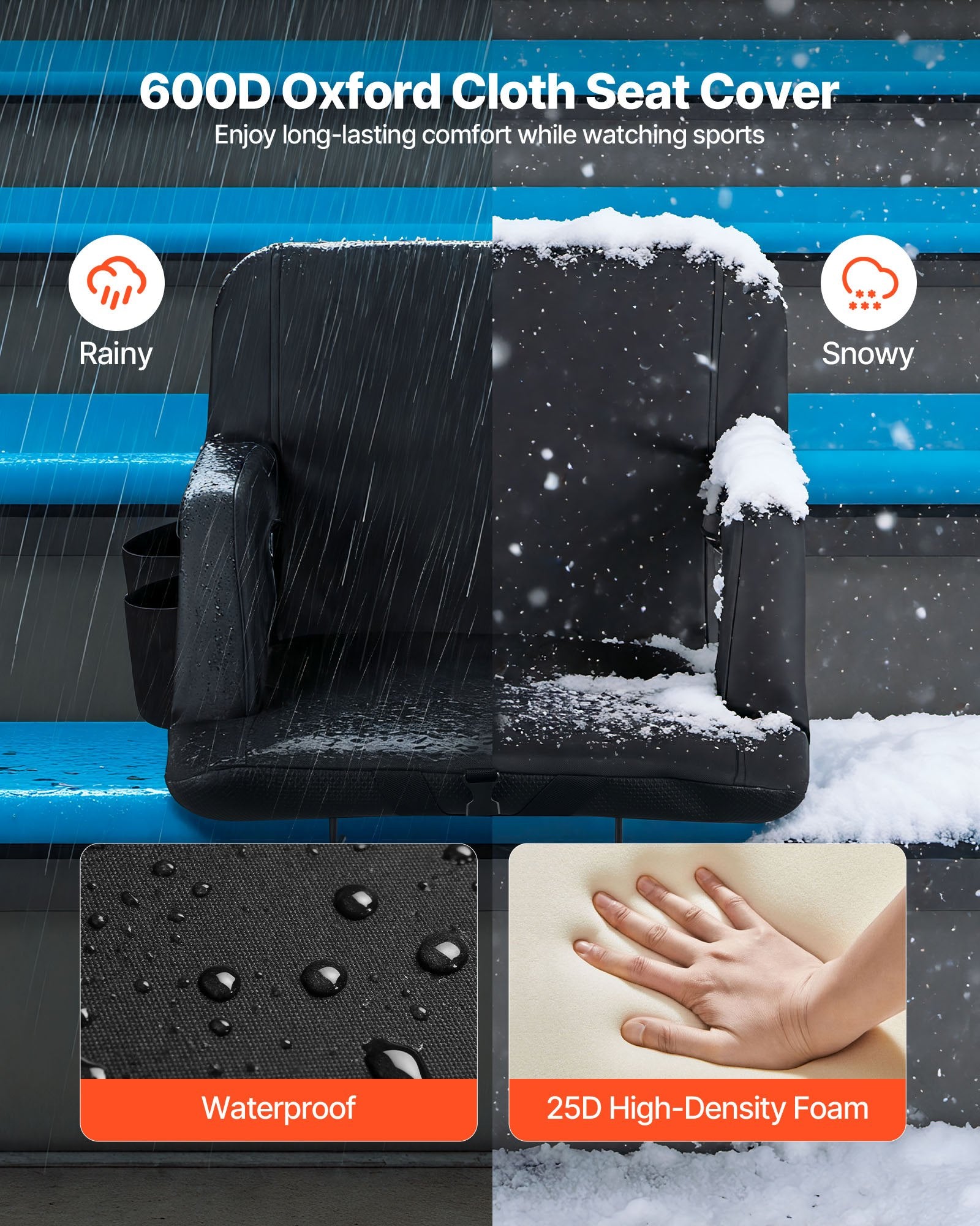 - Bekväm bred sits: Tillverkad av lättviktsstål, tjockt högdensitetsskum och 600D vattentätt Oxford-tyg, är vår läktarstol byggd för att hålla länge och lätt att rengöra. Den 23-tums/584,2 mm breda sitsen och det stödjande ryggstödet ger varaktig komfort under timmar av sport eller utomhusevenemang.