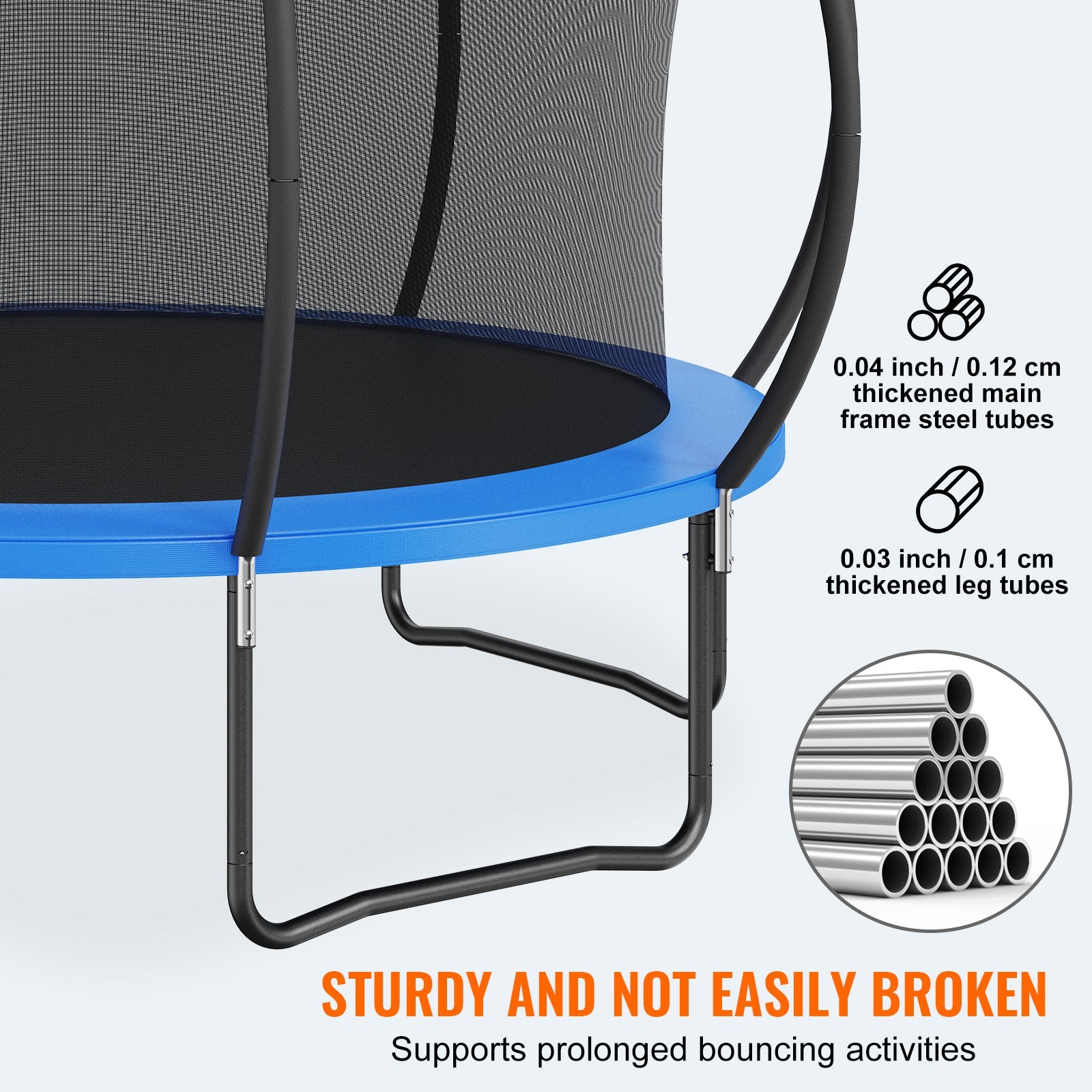 - Hållbar och böjningsbeständig: Denna studsmatta är tillverkad av uppgraderade högkvalitativa material. Dess ringformade bendesign med förtjockade stålrör säkerställer jämnt och fast stöd, vilket gör den motståndskraftig mot böjning även vid långvarig användning. Studsmattan har genomgått rigorösa tester och tål en vikt på cirka 180 kg, vilket gör den lämplig för barn att studsa på.