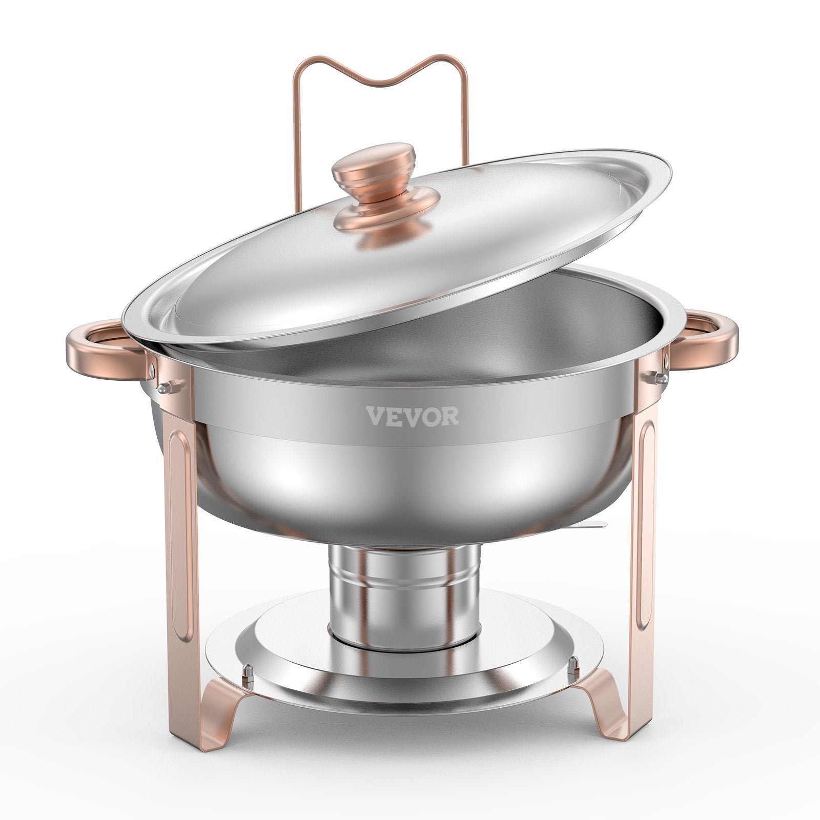Varmfatbufféset, 5 liter, 4-pack, rostfritt stålvärmare med 4 fullstora kastruller, rund cateringvärmare med lock, vattenpanna, hopfällbart stativ, för bröllop, fester, banketter, roséguld