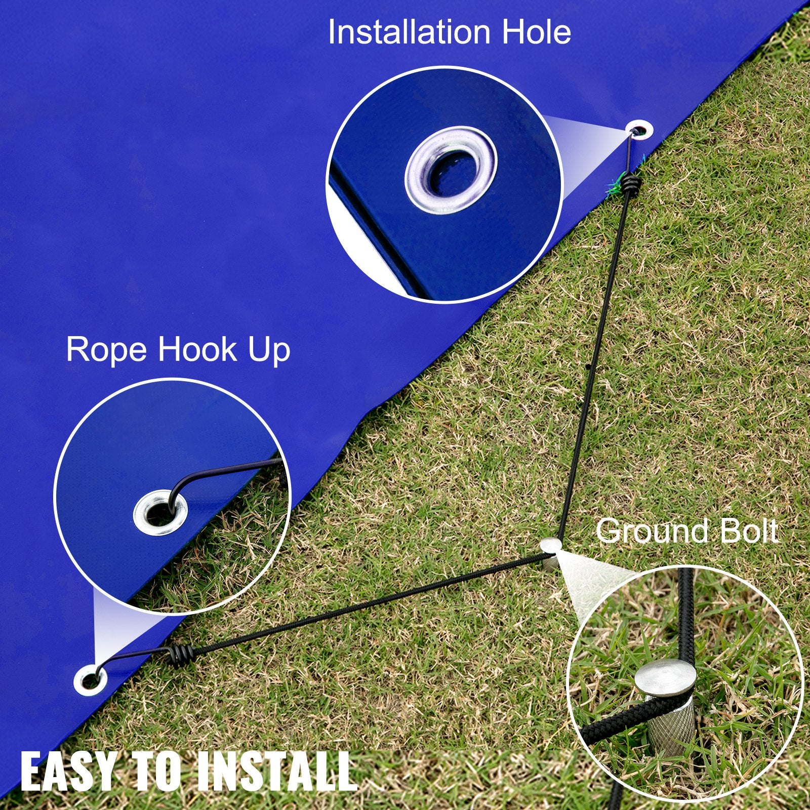 - Enkel installation: Det rektangulära poolöverdraget är säkert fäst vid poolen med hjälp av rep som är anslutna till PVC-överdraget. Ena änden är säkrad med avtagbara jordbultar, medan den andra änden har motsvarande kopplingar för enkel sträckning över poolen.