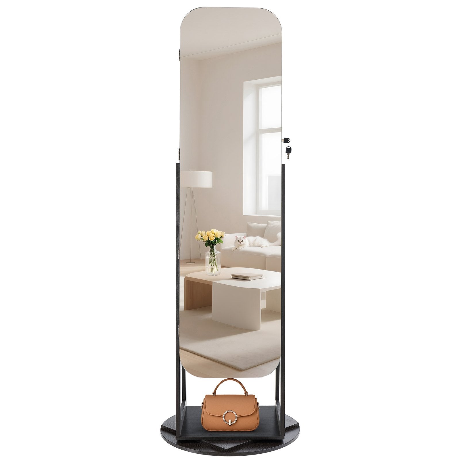 360° vridbart smyckesskåp, 1600 mm högt, helfigursspegel med förvaring, stående roterbar smyckesskåp, låsbar dörr med 2 nycklar, tillbehörsfickor och förvaringshyllor