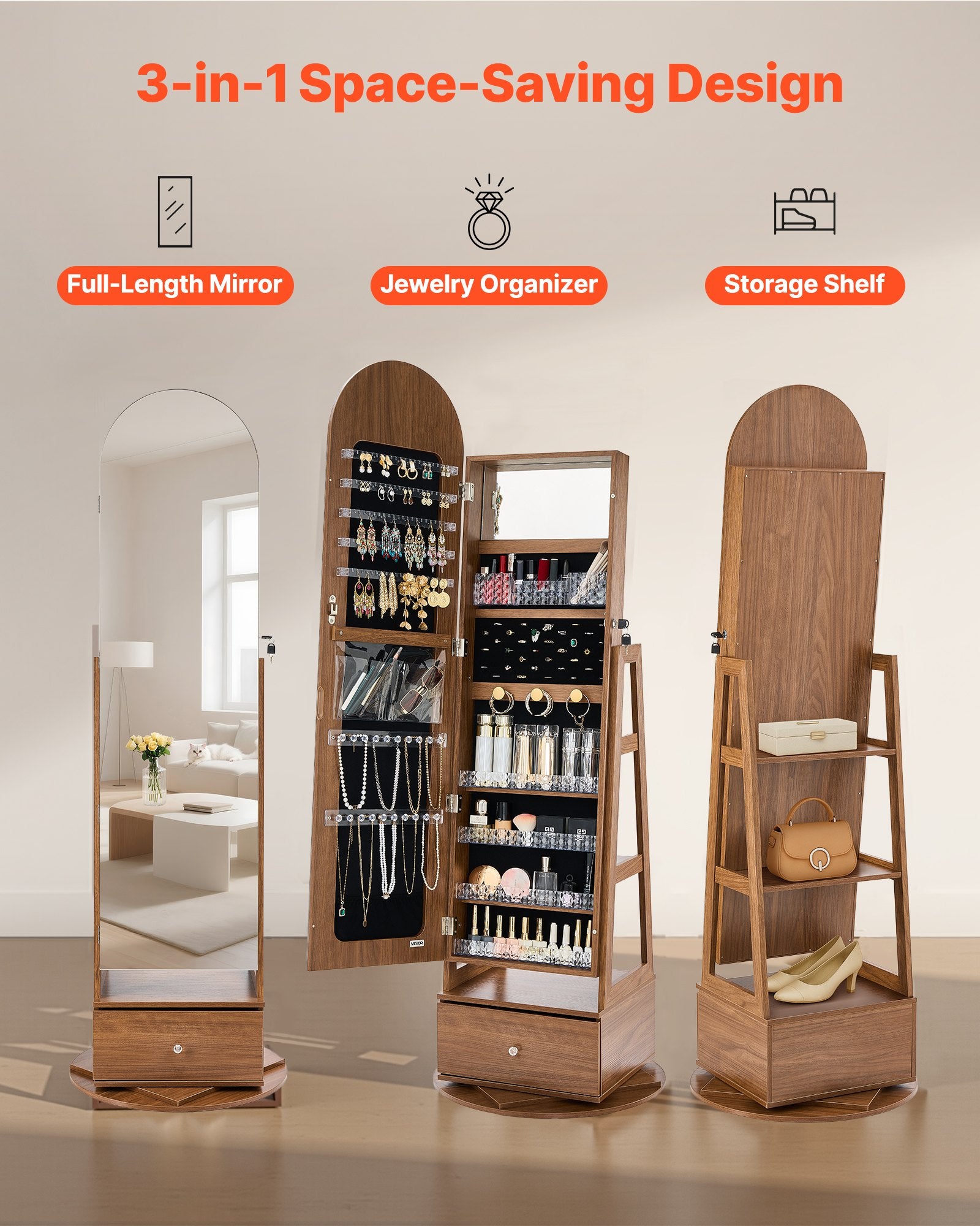 - Funktionell 3-i-1-design: Inte bara ett smyckesskåp – den roterbara smyckesspegeln är en helkroppsspegel med 360° rotation och inbyggd sminkspegel. Förvara skor och väskor nedanför för en komplett överblick över din outfit och gör dig redo för alla tillfällen med självförtroende.
