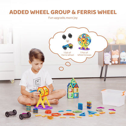 - Oändligt kul: Vårt magnetbyggplatteset kommer nu med hjulgrupper och ett pariserhjul, vilket förbättrar lekupplevelsen! Dessa tillägg ökar inte bara kreativt tänkande och fantasi utan gör också att det blir roligt att lära sig problemlösningsfärdigheter. Barn kommer att älska att utforska de färgglada magnetiska bitarna som lovar oändligt kul.