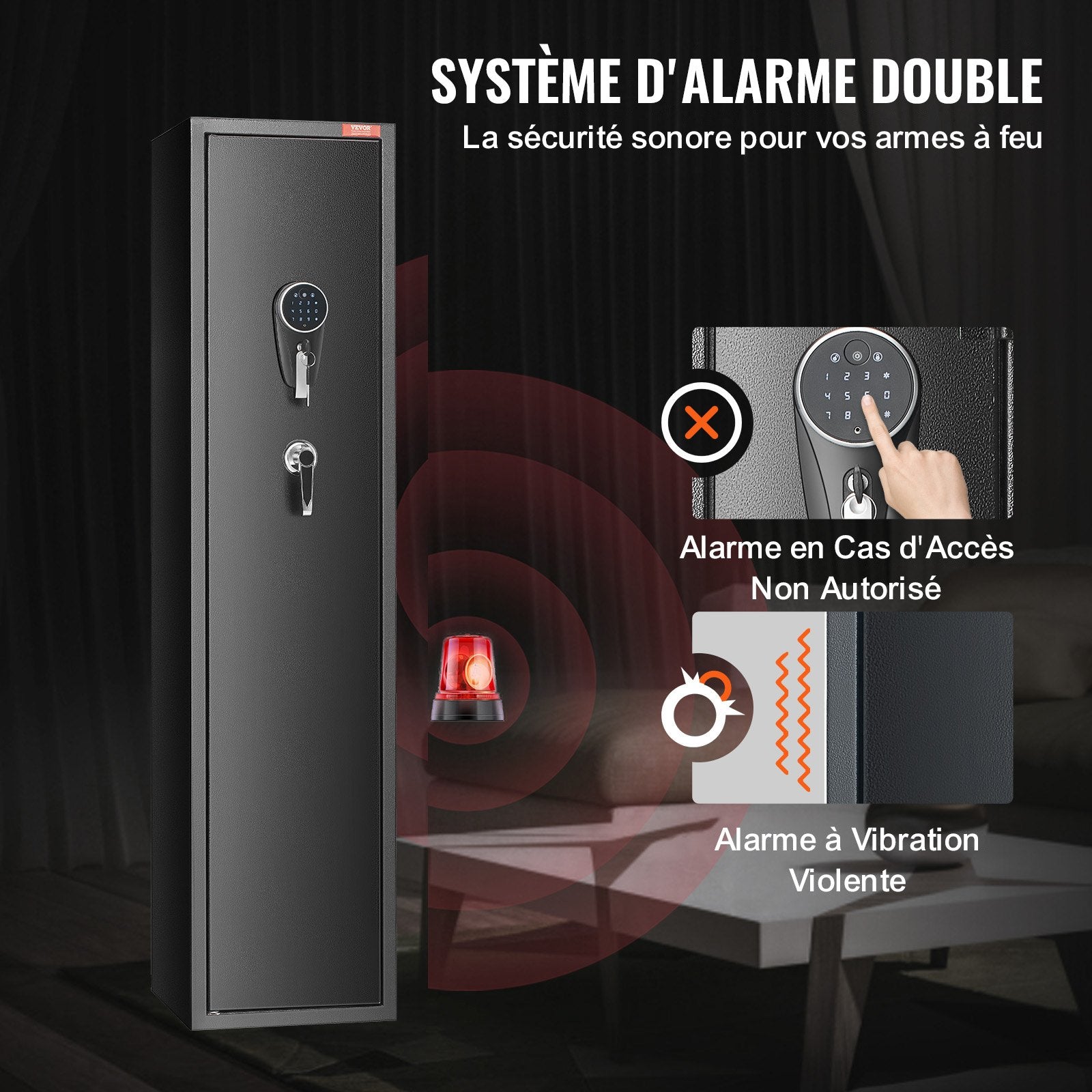 - Larmsystem och tyst läge: Vårt vapenskåp för gevär har ett avancerat larmsystem som utlöser ett 30-sekunderslarm om ett felaktigt lösenord anges fem gånger i följd eller om det upptäcker en våldsam stöt. För diskret åtkomst, aktivera tyst läge genom att trycka på 11#.