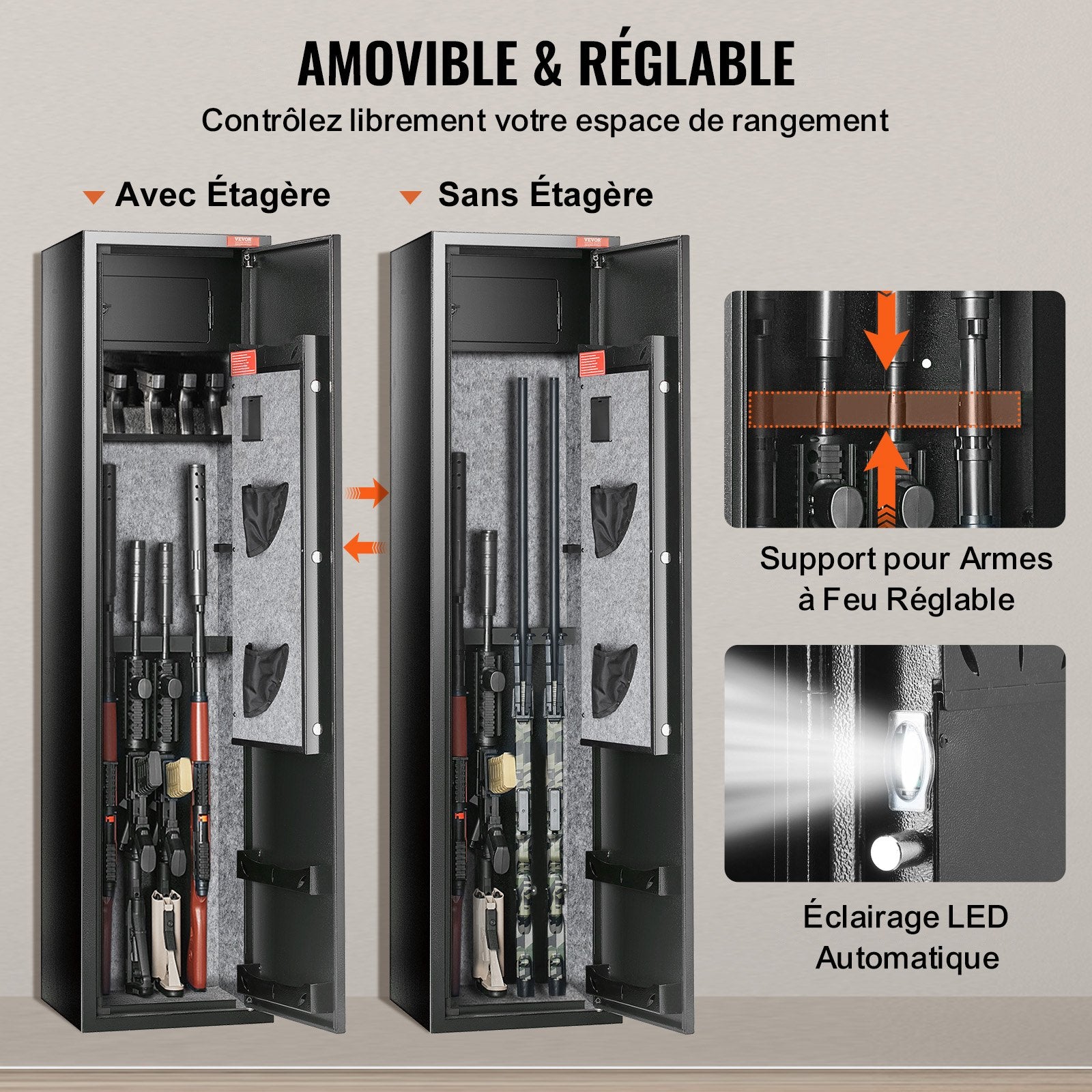 - Skåp för 7-8 vapen med avtagbar hylla: Vårt vapenskåp rymmer upp till fem gevär som mäter upp till 48 tum. Det långa vapenstället är justerbart och avtagbart, vilket ger ännu mer flexibilitet och bekvämlighet. Skåpet på toppen har också ett pistolställ för 4 vapen och tre kulhylsor för att hålla alla dina skjutvapen och tillbehör organiserade.