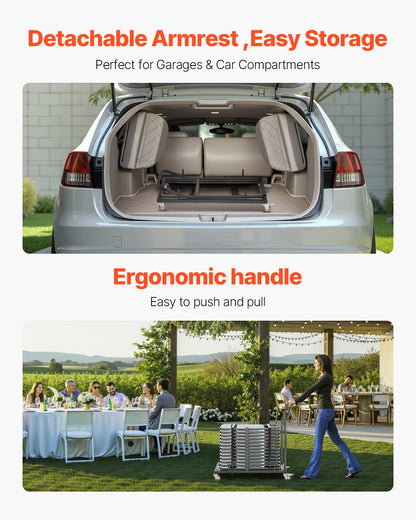 - Produktmått: Med en längd på 112 cm, en bredd på 51 cm och en höjd på 112 cm har vår hopfällbara stolsvagn en maximal lastkapacitet på 146 kg. Detta gör att du kan förvara upp till 25 stolar (Obs: Inkluderar inte hopfällbara stolar), vilket ger flexibilitet och platsbesparande komfort.