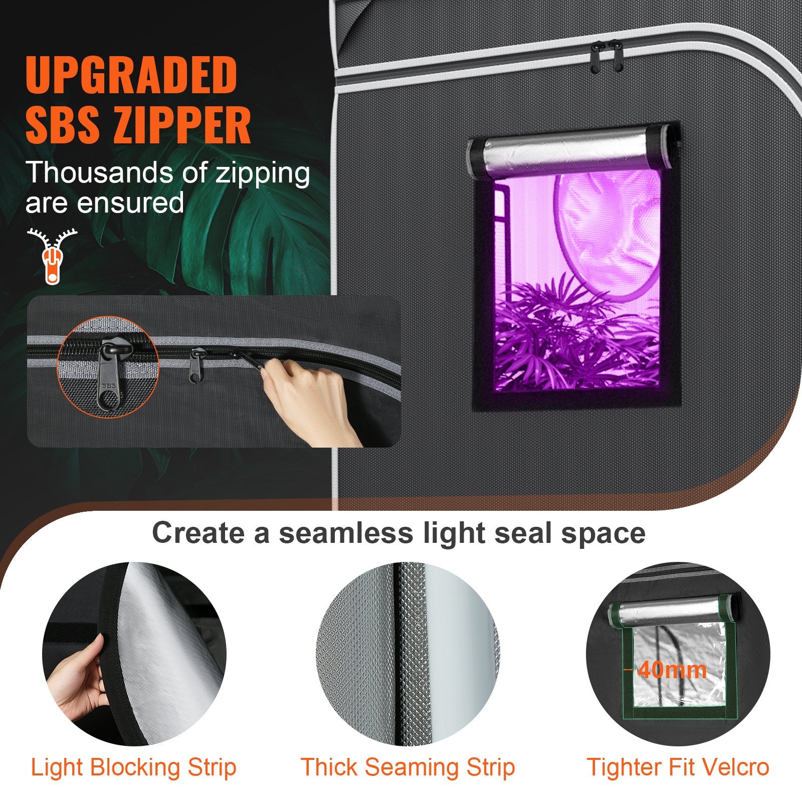 - Lys upp rummet: Vårt inomhusodlingstält har uppgraderats med många detaljer för att ge en ljustät miljö. Vi har lagt till bredare och tjockare remsor vid varje söm för att blockera ljus, och en premium SBS-dragkedja säkerställer smidig och hållbar användning, även efter flera öppningar och stängningar.