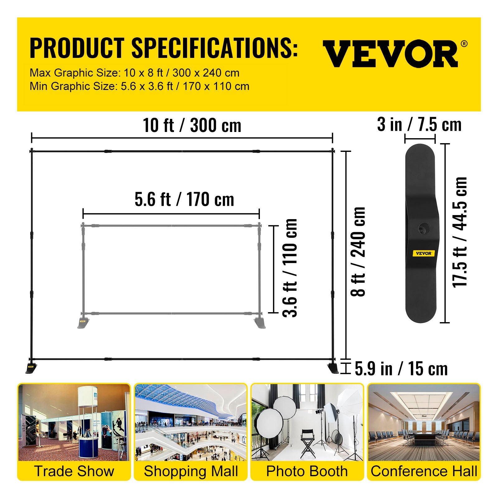 - Adjustable Display Size: The backdrop frame features a telescopic design with adjustable width of 5.6-10 ft/170-300 cm and an adjustable height of 3.6-8 ft/110-240 cm. All poles are easily retractable by loosening the joints, convenient to fit for banners or posters in different sizes.