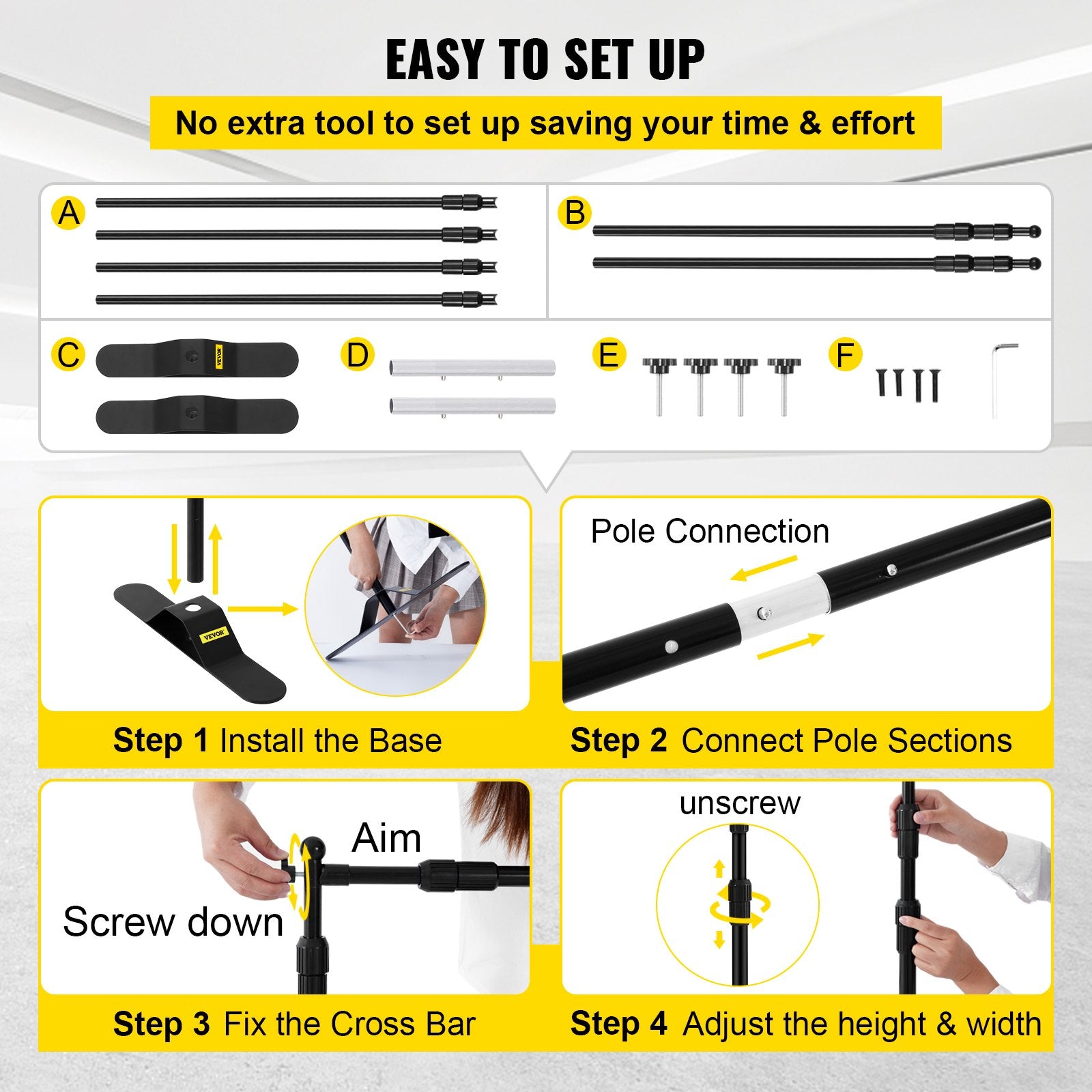 - Set Up in Minutes: Our backdrop stand is easy for one person to assemble and disassemble in a few minutes. No extra tool to set up, saving your time & effort. You only need to install bases with equipped screws & wrench, connect pole sections, and adjust the frame to the required size.