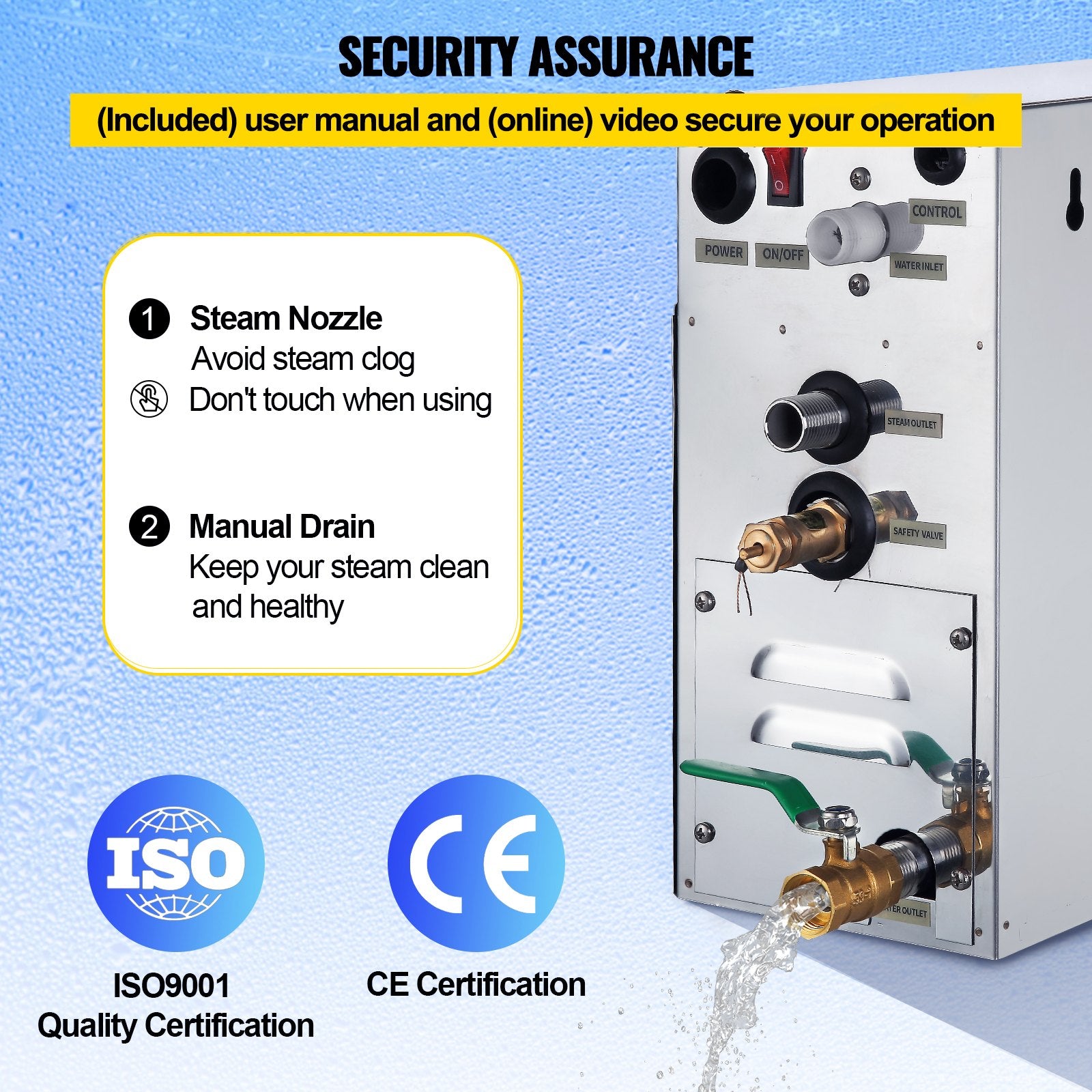 - Multiple Protection: If you have problems with installation and operation, feel free to watch the online video included in the user manual. In addition, the steam nozzle can prevent steam from clogging, and the manual drain keeps your steam cleaner. ISO9001 Quality and CE certification included.
