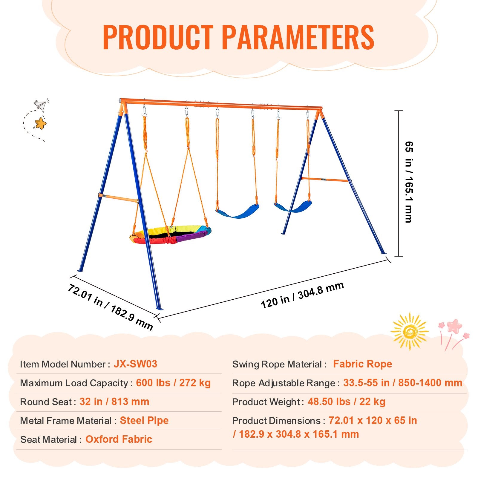 Swing Sets for Backyard, 600lbs Load Capacity Swing Set, with 1 Saucer Swing Seat, 2 Belt Swing Seats, Heavy Duty A-Frame Metal Swing Stand and Adjustable Rope, Swingset Outdoor for Kids