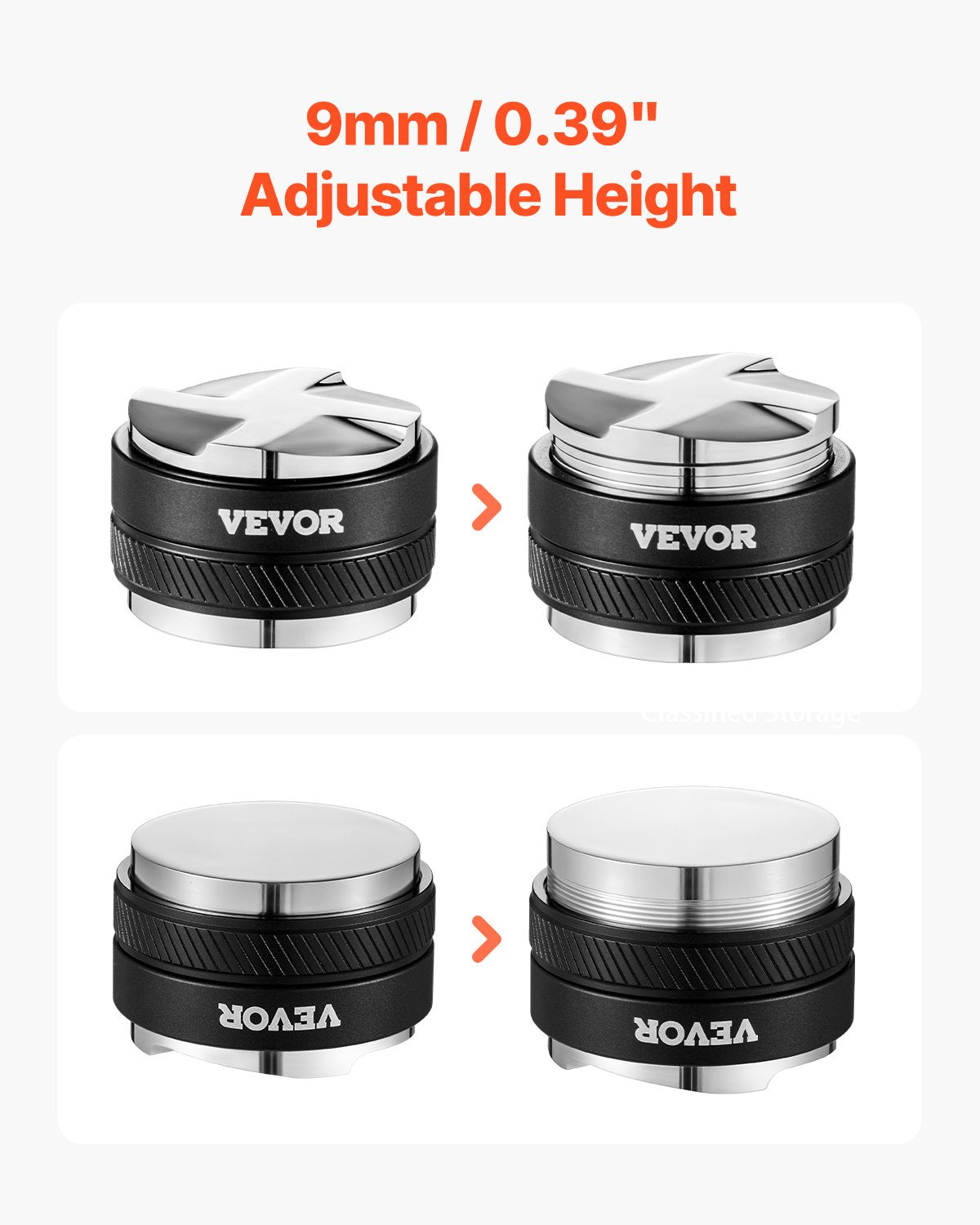 - 0.39" Adjustable Height: This coffee distributor’s Height adjustment accommodates different portafilter depths, ensuring a consistent tamp and higher-quality espresso, whether using standard or custom-sized portafilters.