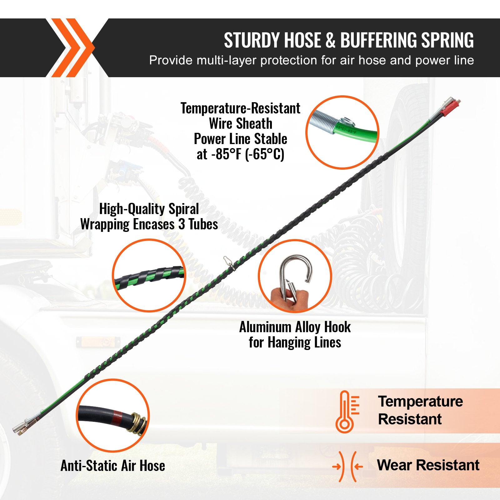 - 12FT Semi Truck Air Lines Kit: VEVOR 3-in-1 semi truck air lines kit is the ideal solution for replacing old, worn-out, and tangled standard ABS air power lines. It includes 1 pre-installed hook and 1 Teflon tape, making it perfect for air hose kits with less wear. 12 ft length is compatible with small truck models such as Philips 30-2151, 302171; Tectran 169157, 13S15401; and OTR 6818, 6814.