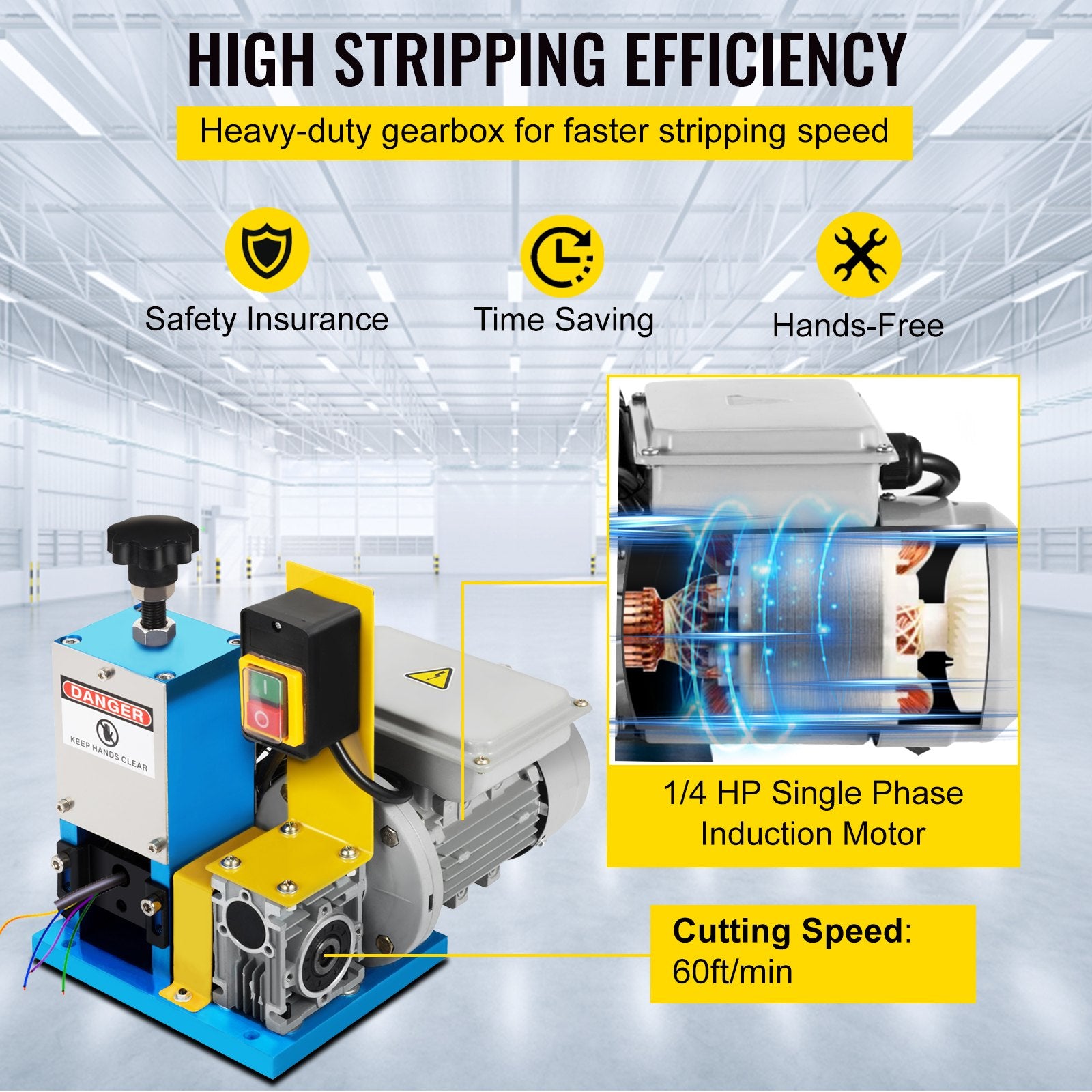 - High Stripping Efficiency: This wire stripper features a 180W 1/4 HP single phase induction motor, motorized to save you time, effort, and money. The gearbox leads to fast stripping speed. It creates a fast stripping speed of 60 feet per minute, plus the laborsaving design increases security and convenience.