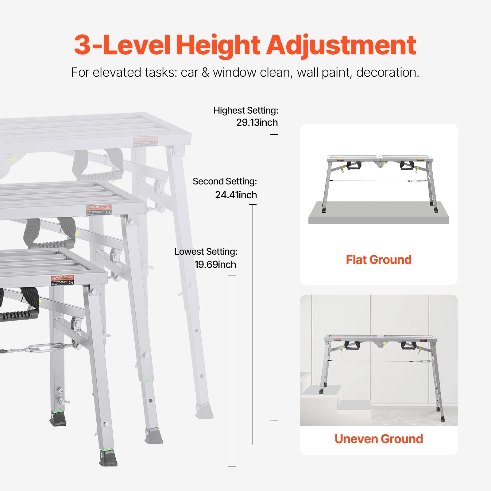 - Adjustable Height for Versatility: The scaffolding platform offers a range of height adjustments, with three settings: 1.97 inches, 2.44 inches, and 29.13 inches. This adaptability empowers you to tackle a wide range of tasks, from car washing to building renovations, with ease and confidence.
