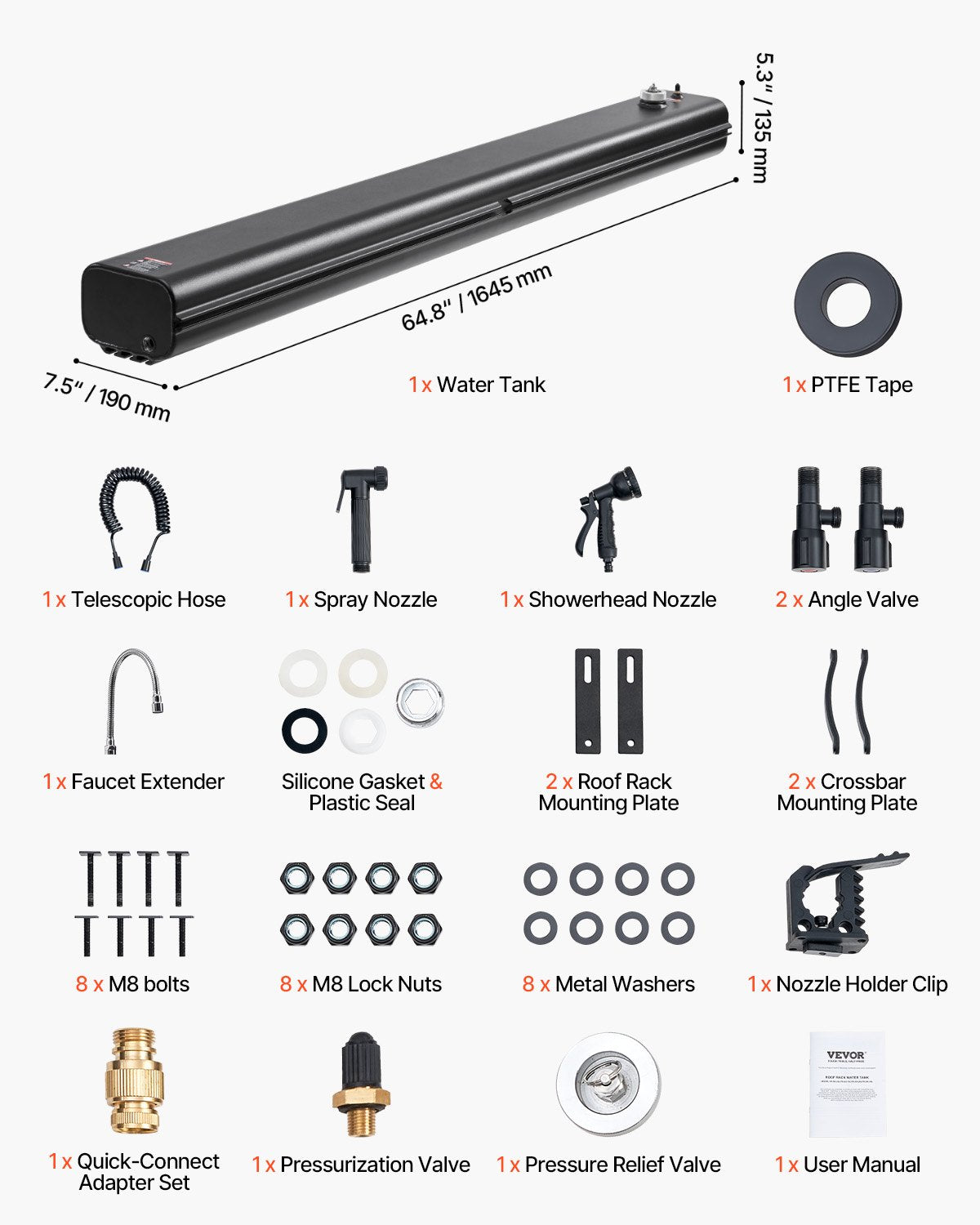- Flexible Mounting Design: The t-slot design in the water tank allows secure installation on roof racks, roll bars, trunks, or crossbars. It includes mounting plates for both crossbars and roof racks for added stability.