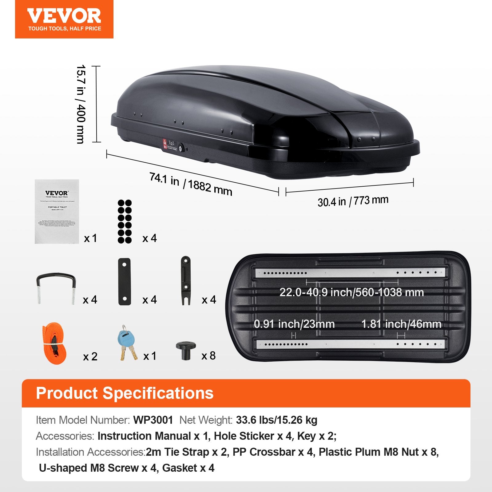 - 14 cu.ft / 370 L Capacity: The rooftop cargo box maximizes roof space, providing extra spacious storage. It supports a max load of 165 lbs and includes two straps to securely fasten items inside, meeting diverse storage needs.