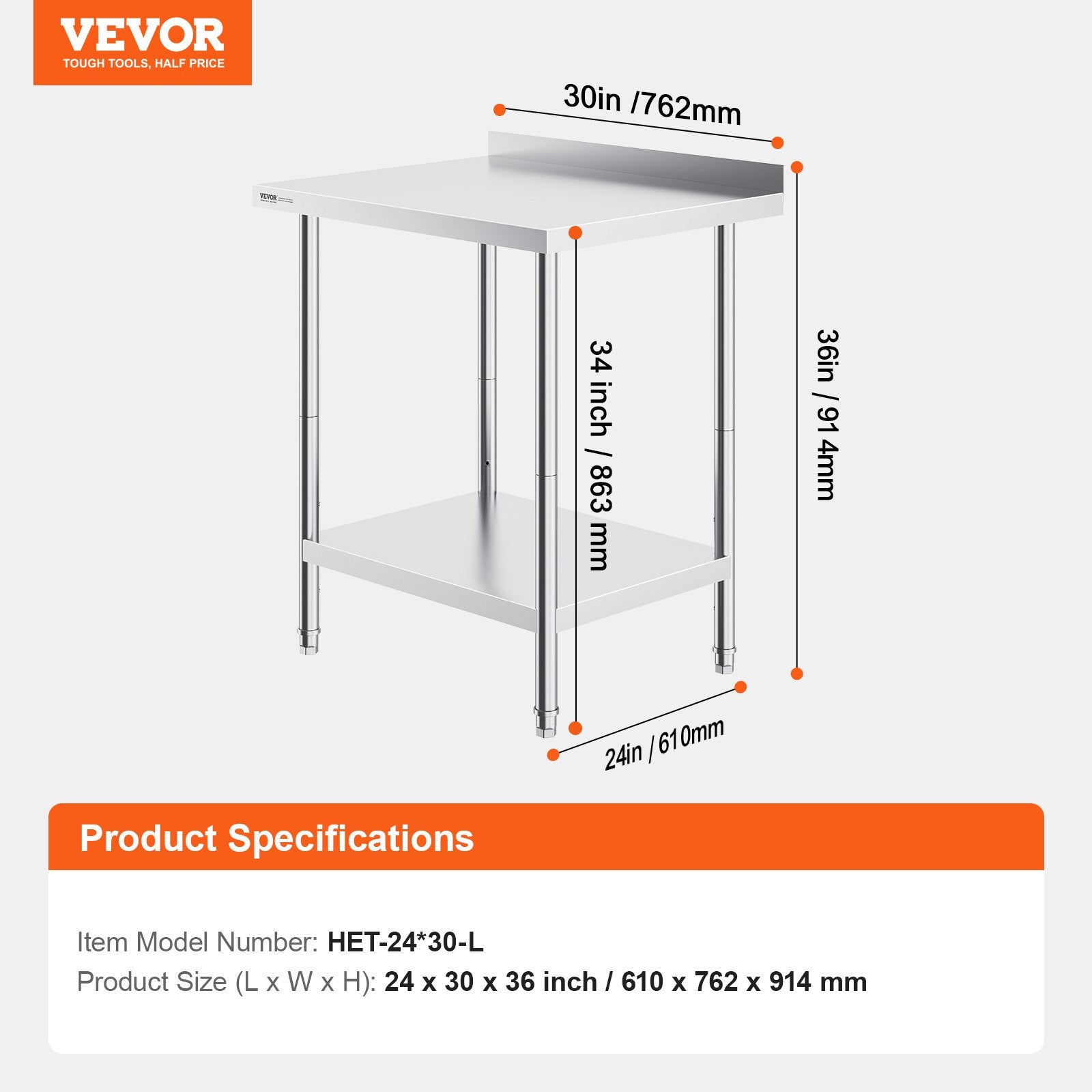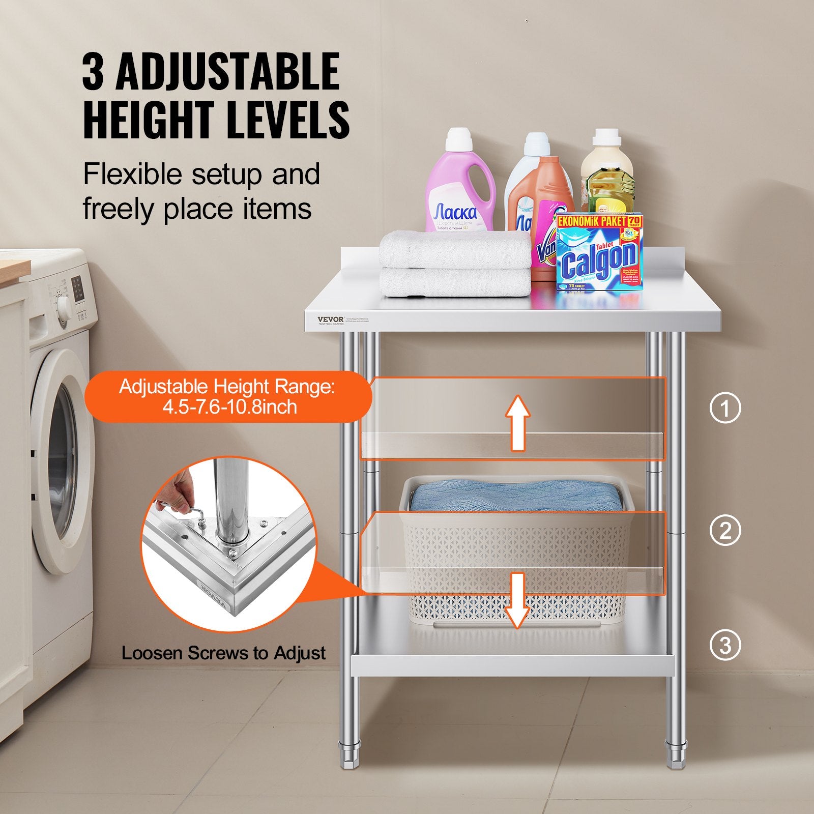 - User-Friendly Design: Featuring 3-level adjustable shelves, this work table offers the most user-friendly and practical functionality. Simply adjust the shelf height with screws to accommodate items of different sizes. The high rear backsplash prevents items from falling off and guards against water splashes.