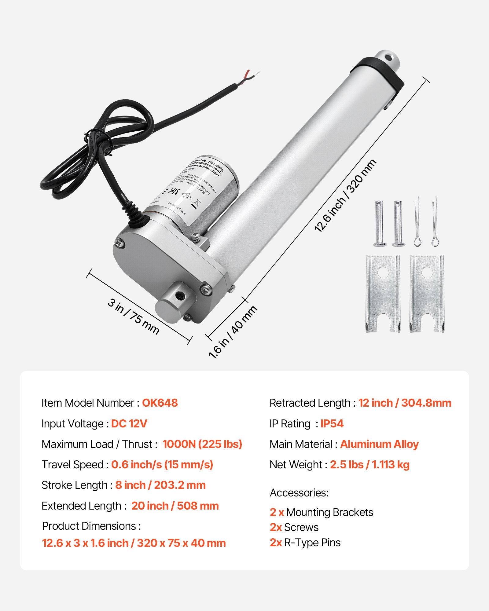 - Key Specifications: Travel Speed: 0.6"/s (15 mm/s); Stroke Length: 8" (203.2 mm); Extended Length: 20" (508 mm); Retracted Length: 12" (304.8 mm); Current Draw: 5 Amps; Input Voltage: DC 12V; Duty Cycle: 25%