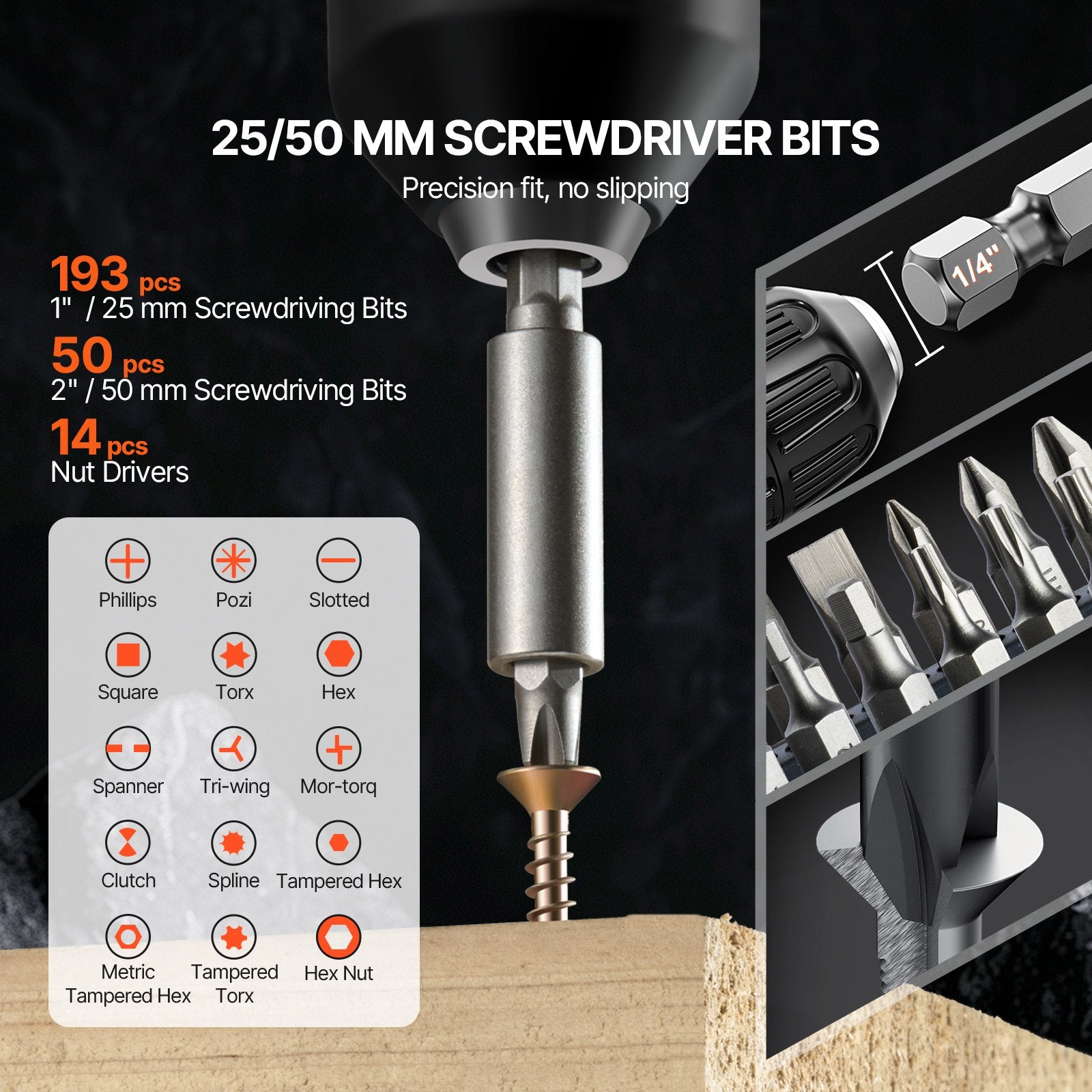- CR-V Durable Bits: The screwdriver bit set is made from upgraded CR-V material for better toughness and durability. With 257 specifications, it ensures a tight grip on screws without slipping, making fastening and loosening parts easy and effortless.