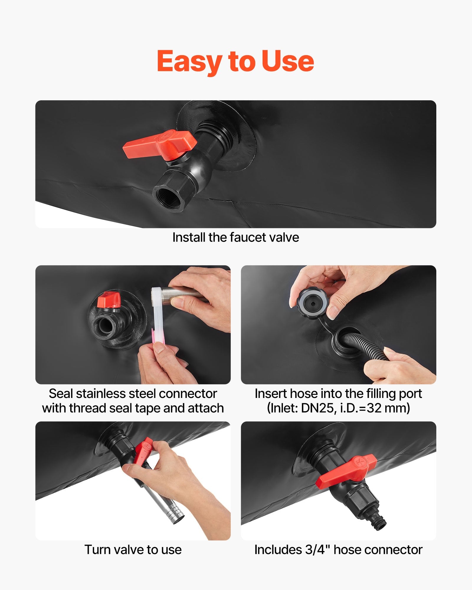 - Easy to Use: The water storage bag comes with pre-installed inlet (DN25, outer thread 32 mm) and outlet (DN20, outer thread 25 mm) connectors allow quick setup. Simply attach the included faucet valve and connect a garden hose for filling or draining—ready to use in minutes.