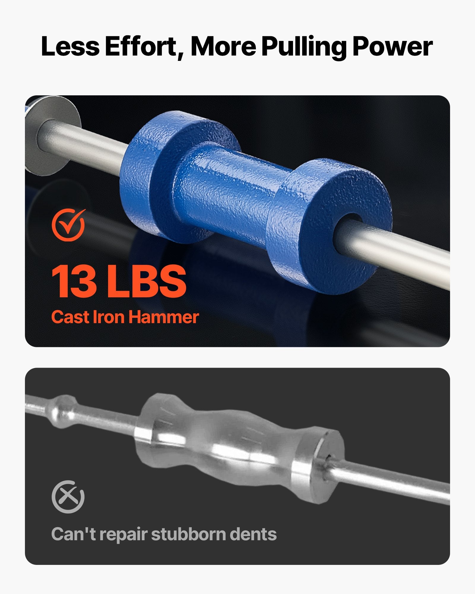 - 13 lbs Heavy-Duty Slide Hammer: Our paintless dent removal kit features a 13 lbs cast iron slide hammer that delivers a powerful pulling force. It's built to handle deep, stubborn dents with ease, helping you repair faster and more efficiently